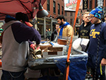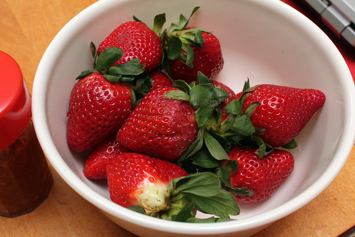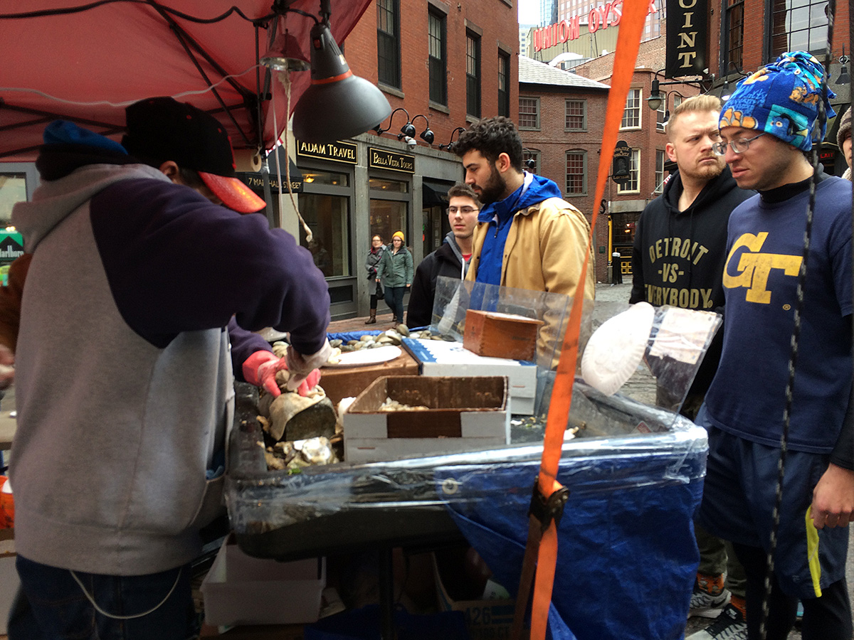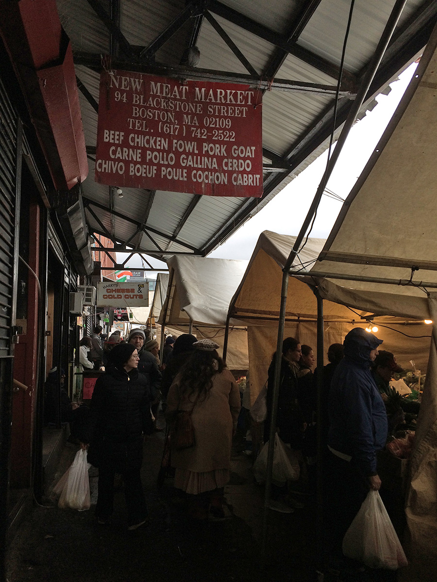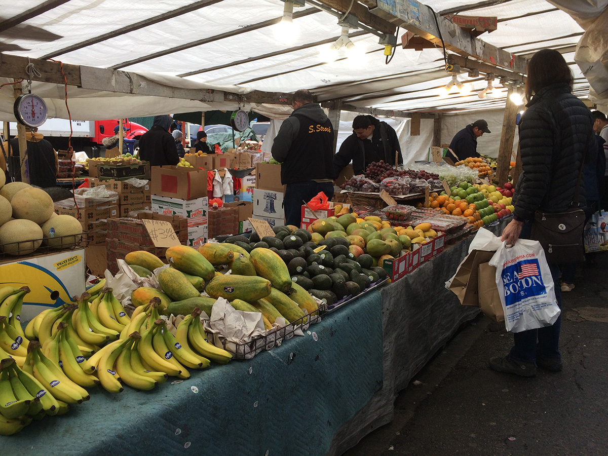 we arrived without incident. i first took her to boston public market, figured as a nutritionist she'd be interested in seeing some higher end local food. next we went to haymarket, which was the exact opposite in the form of a cheap outdoor produce market. karen seemed to like it, was surprised by how big it was, and said she'd definitely take her visiting friends her. she bought a few vegetables and fruits, including tomatoes, bananas, onions, and some pears. as for me, i got a large box of strawberries ($2), a large box of blueberries ($2), a bag of honeycrisp apples for $1.50, 2 ripe avocados ($1), $2 worth of long hot peppers, and a bundle of thin asparagus ($1, inspiring karen to get some as well).