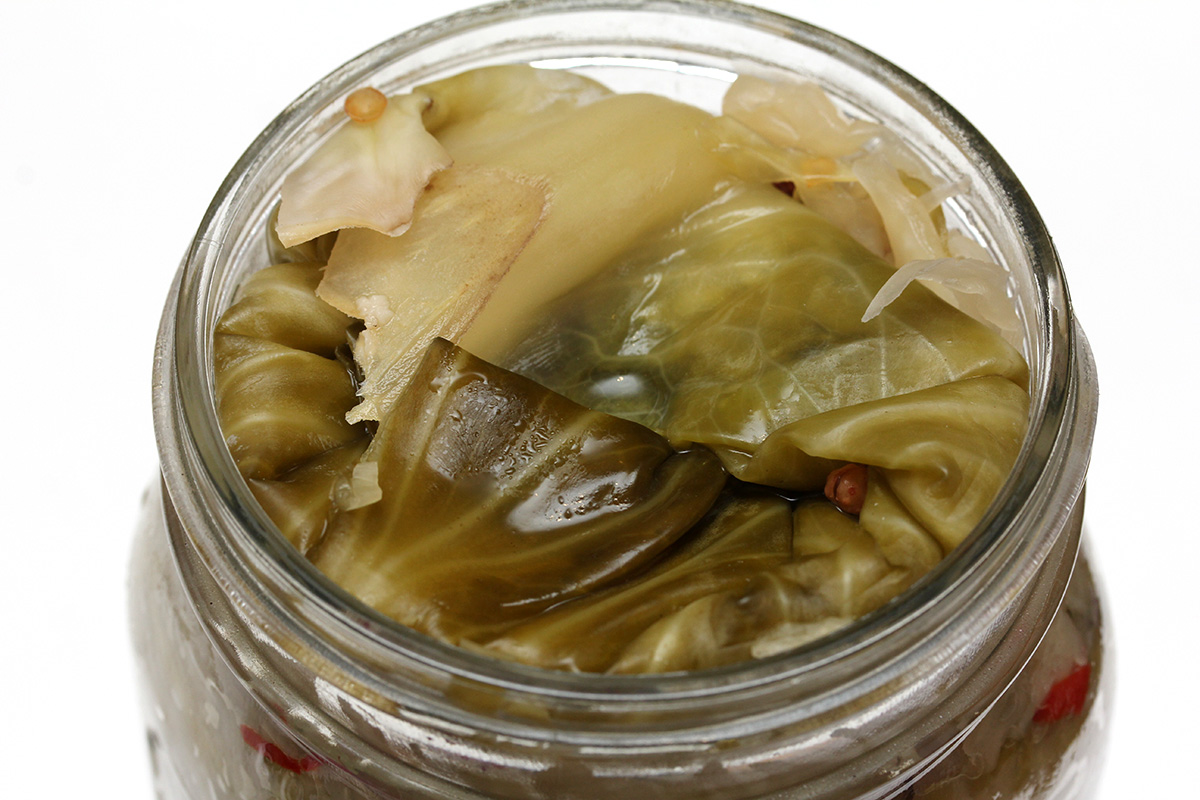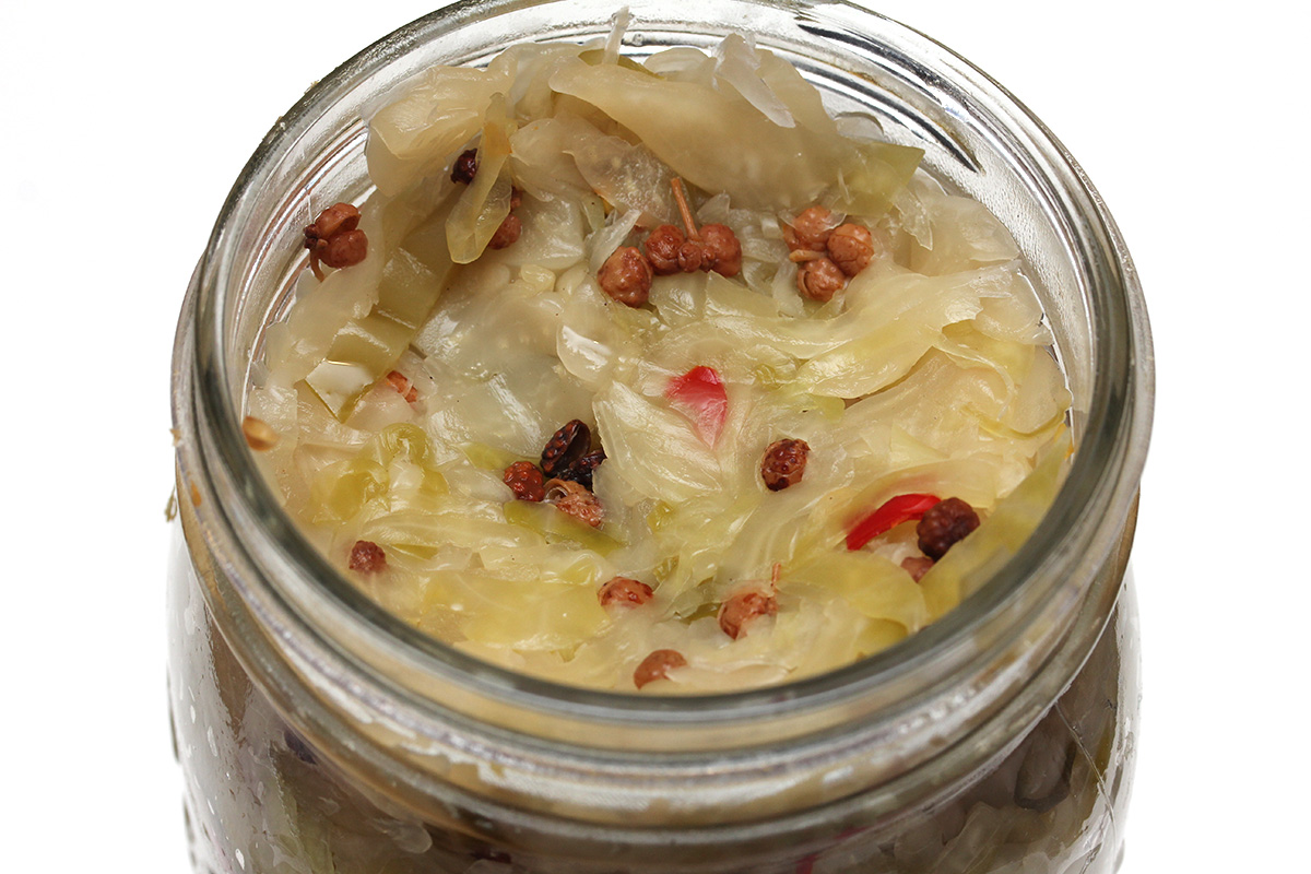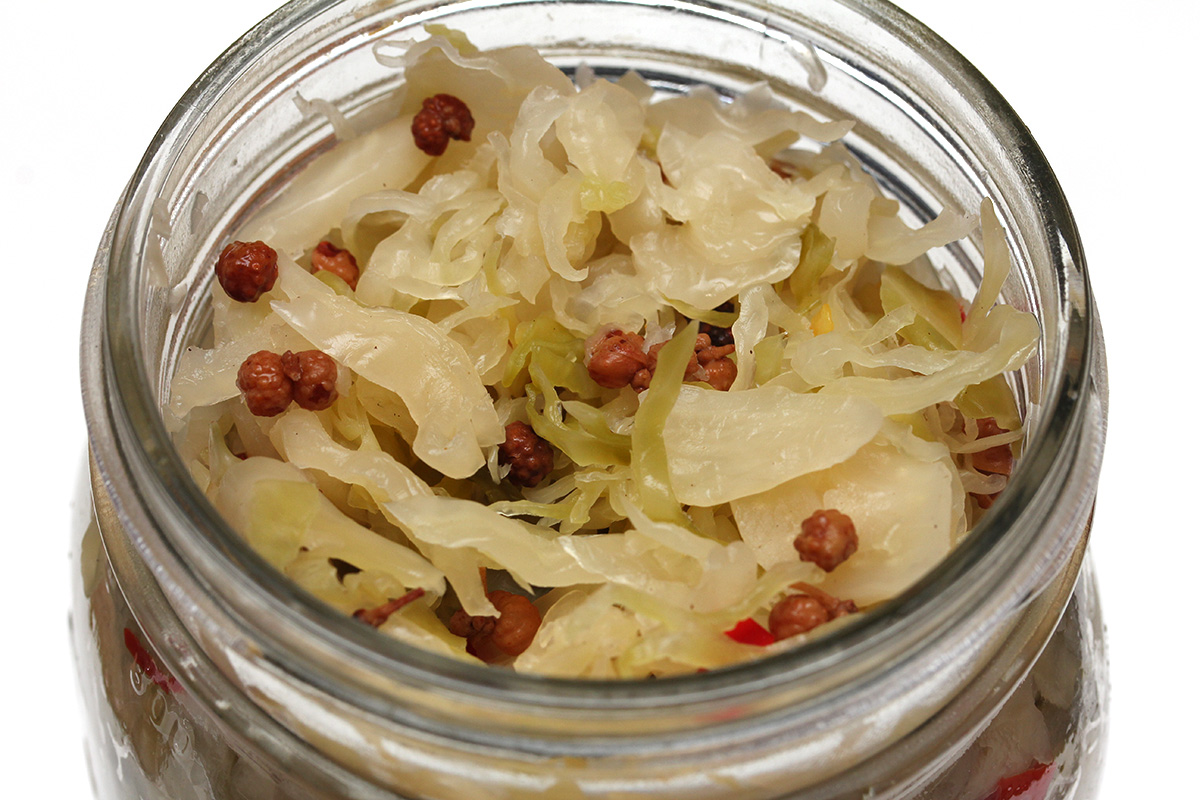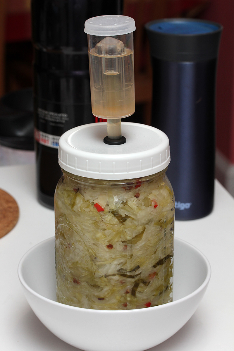 here below is my first live example of a lightbox-lazyload-mosaic. i've been fermenting my sichuan-style sauerkraut for over a month now, it's finally ready to eat. it wasn't fizzing like a typical jar of sichuan paocai, simply because the airlock allowed the carbon dioxide to escape so it could never be carbonated. it did smell like sichuan paocai, but not as strong because of the escaped gases. there was a cabbage leaf plug which i tasted a little bit but it was kind of soggy and didn't taste all that great so i tossed it. as for the sichuan sauerkraut itself, it does taste like sichuan paocai, but the flavor isn't as strong, the shredded cabbage has a softer texture. another problem is too much of the fluids had escaped, which is typical of my jar sauerkrauts, so the final product was a little dry. i should try it again with a taller jar (2 quart jar) so there's plenty of head room to prevent the juices from overflowing out the airlock.