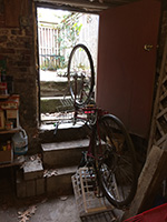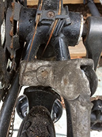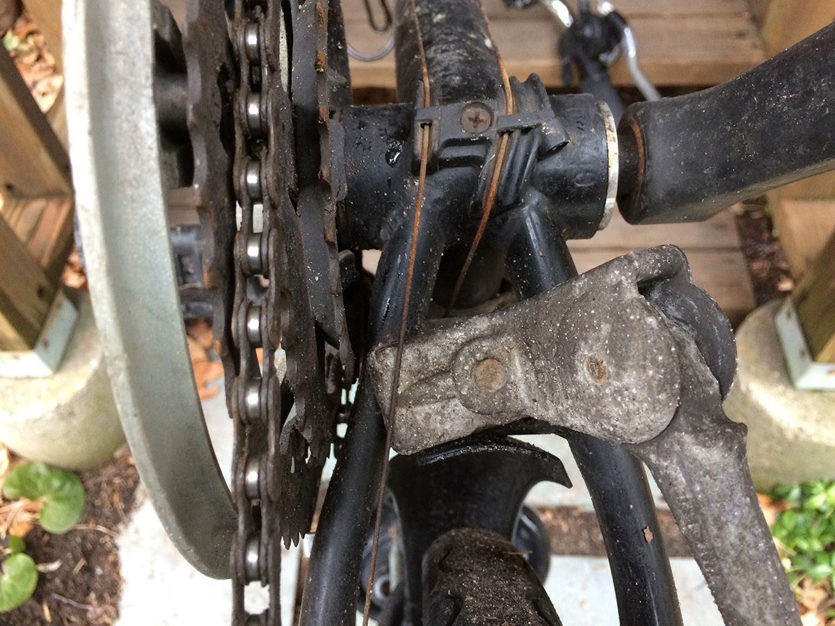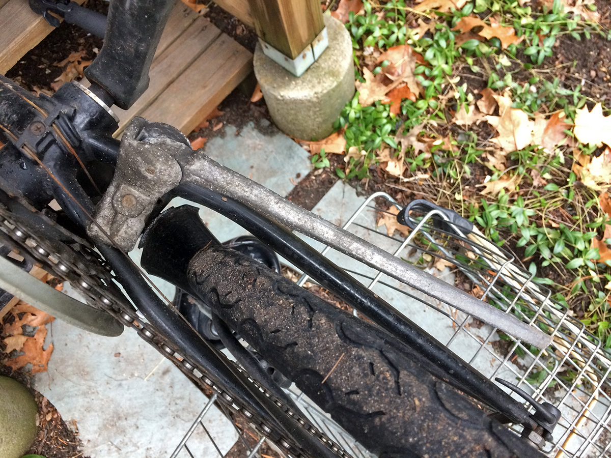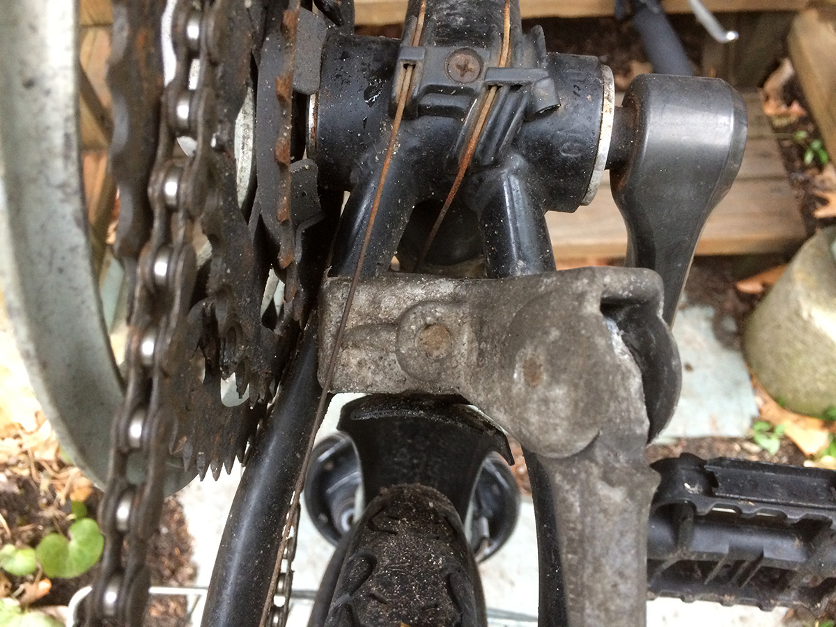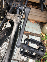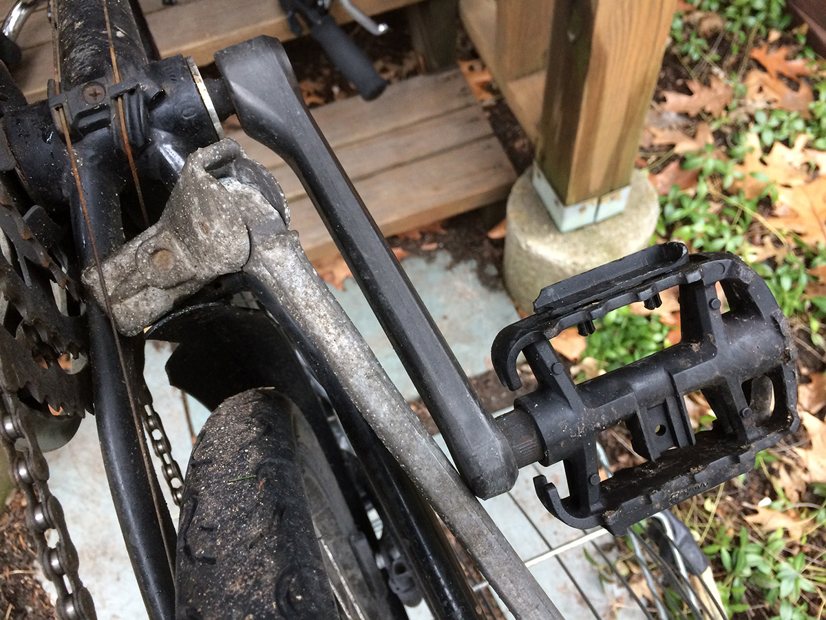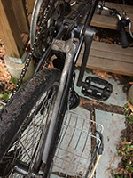 an easy fix, if i could adjust the kickstand. i got my tools and tried to loosen the bolt holding the kickstand bracket clamp to the frame. no matter how hard i pried, i couldn't loosen that bolt. this would require some pretreatment with so oil first to penetrate inside the bolt. but before i went back inside to get the WD-40, i thought maybe i could just whack the kickstand back into alignment. i didn't even have to whack it, as a forceful pull was enough to get the kickstand back in place. the case of the rickety bike pedal has been solved!