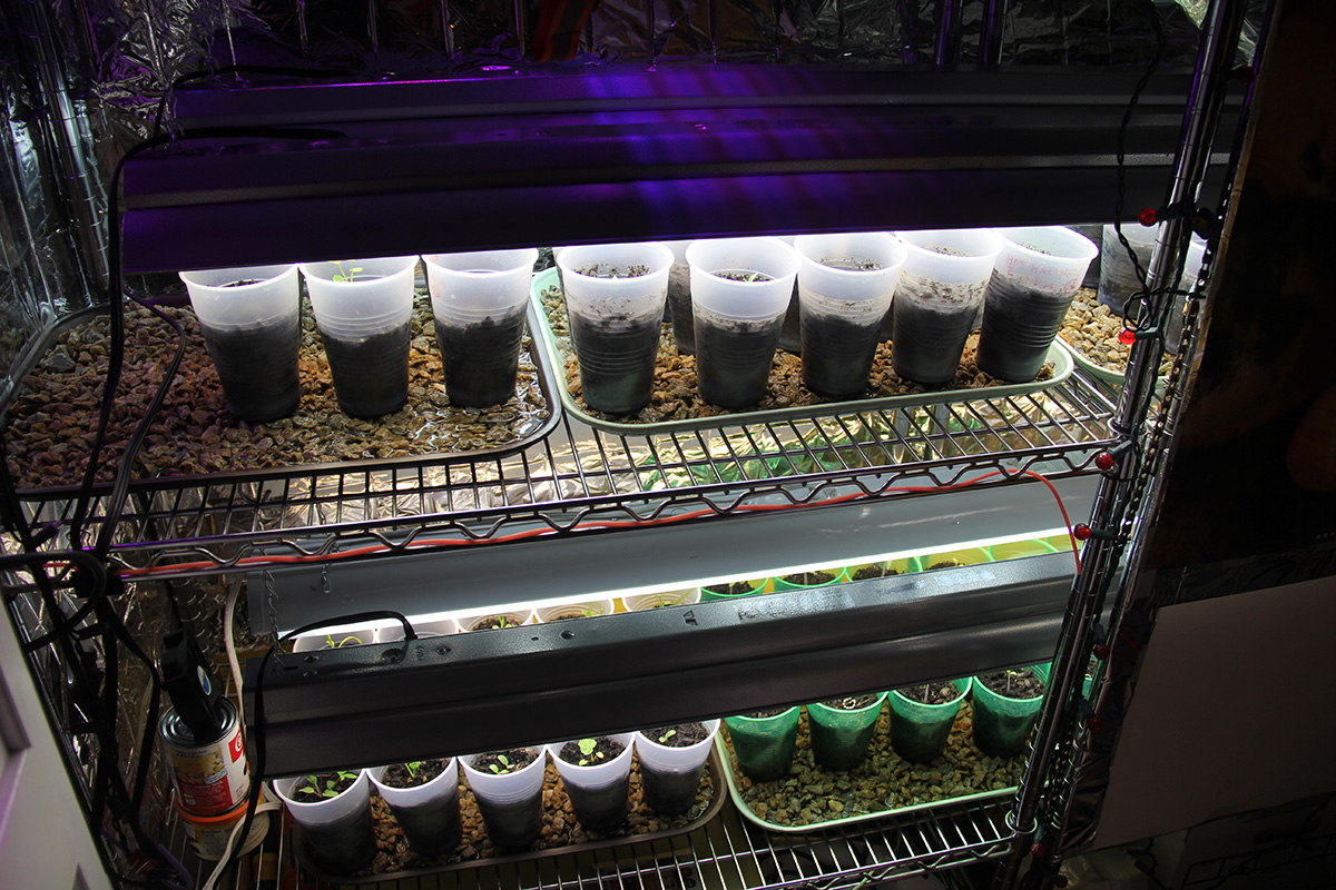 every few days the grow closet needs to be watered. not only the cups but also the gravel tray needs watering, to maintain the proper moisture level so the seedlings don't dry out. i thinned out a handful of new seedlings that sprouted within the past few days, an eggplant, a pepper, a tomato.