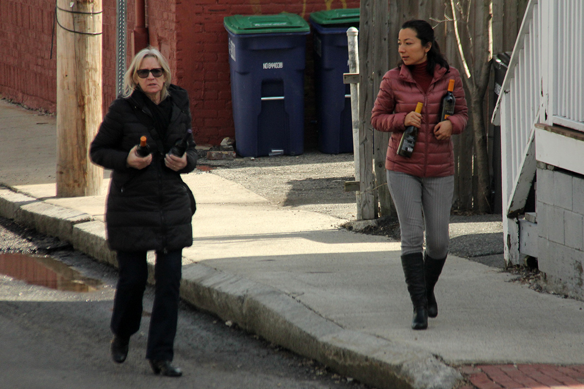 karen's friend began loading her stuff into her car this morning. before she left, they went to the corner liquor store to buy some wine.