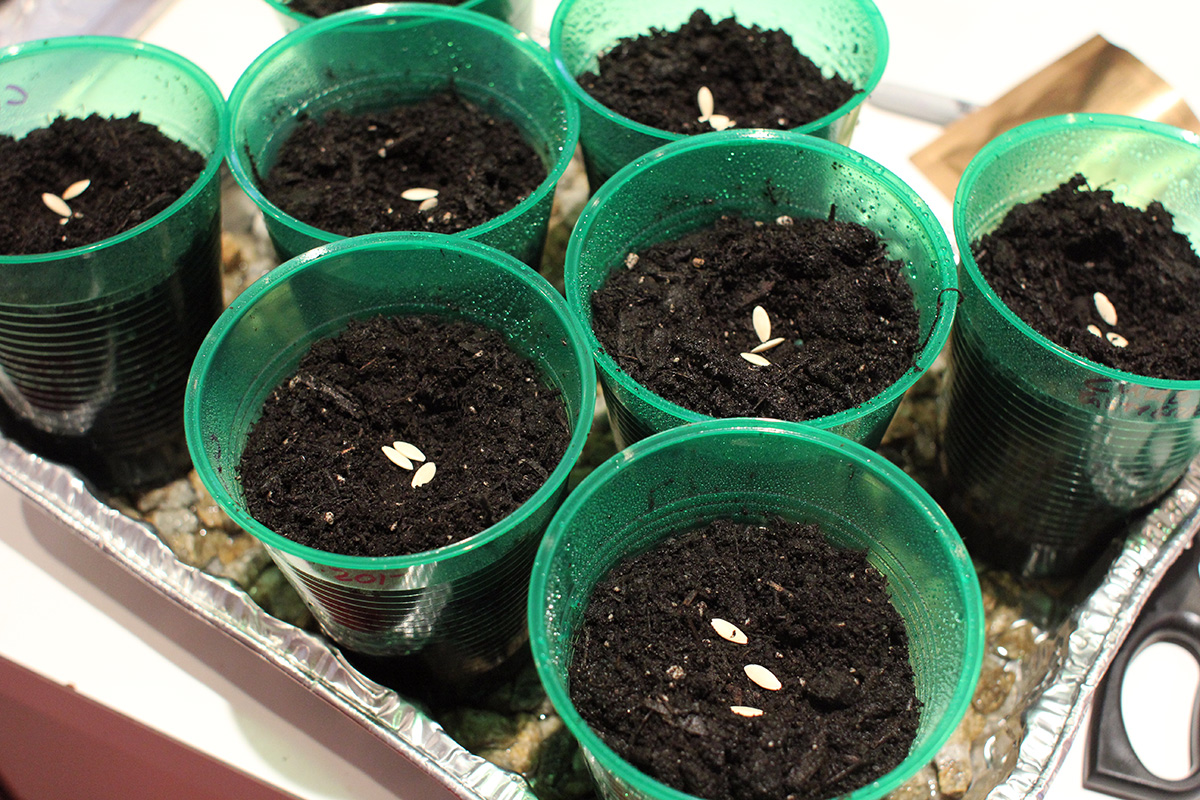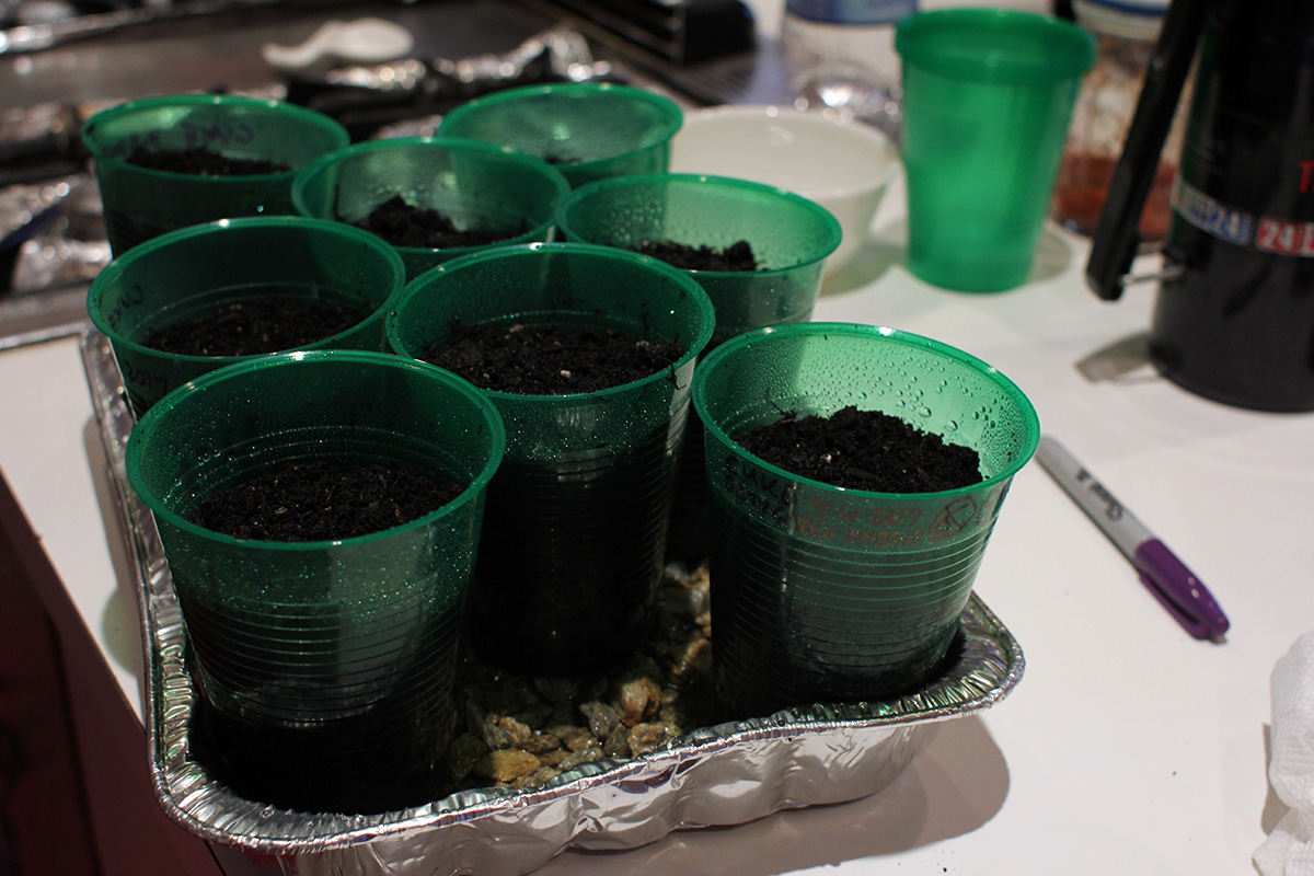 after puncturing some drainage holes in the cups using a heated awl, i used up my leftover potting soil and managed to fill 12 cups. 8 cups i planted tasty green hybrid cucumbers, put them in a used aluminum tray with a bottom layer of gravel and water. of the remaining 4, i transplanted a leftover lupine and moved 3 surplus gazanias. there was no more space left for the cucumbers so i put them on the very bottom shelf, assuming they don't need light to germinate. once they do (in a week or so) i'll need to find some room for them.