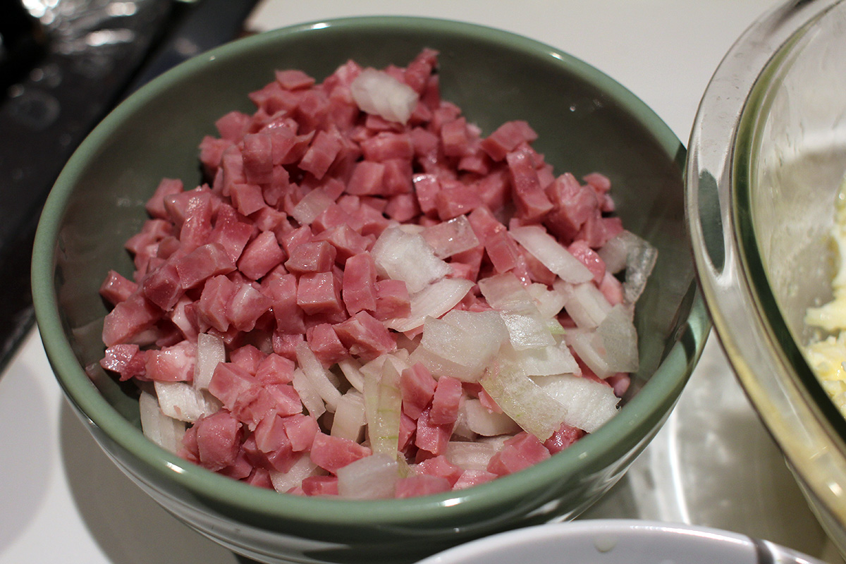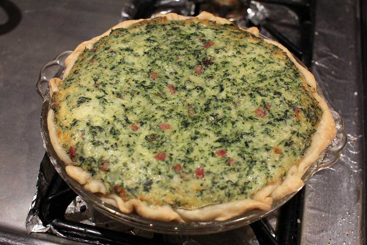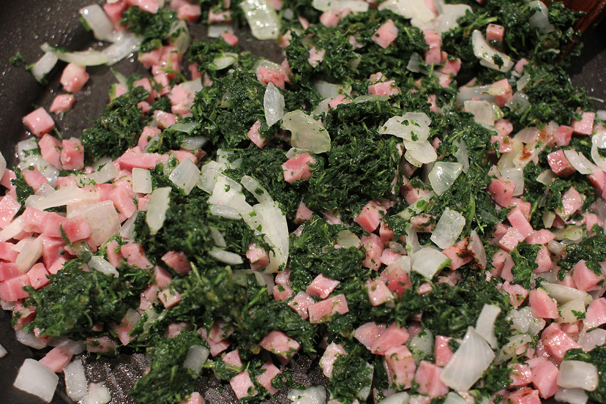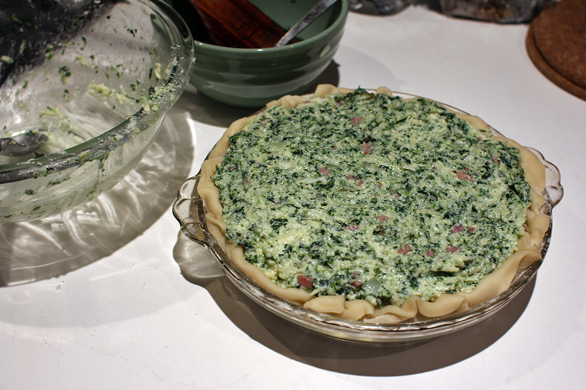 i followed a basic recipe but changed some of the ingredients. as if there wasn't already a lot of proteins, i also like to add some meat to this pie. last time i tried some prosciutto, but that ended up being a waste of perfectly good dry-cured italian ham. i used simple ham this time around, prepackaged and already diced. i used 8 oz. of a mozzarella provolone blend, and 6 oz. of shredded parmesan. i might've added too much parmesan, because the recipe asked for 1 cup (more on that later). the recipe also calls for a dash (1/4 tsp) of nutmeg, which i've never add. i consider nutmeg a sort of dessert spice, and a winter dessert at that. adding it seems unusual, but i had some on hand so i did as directed. it made the sauteed ham onion spinach smell sort of funky, and i was afraid it would ruin the flavor of the quiche.