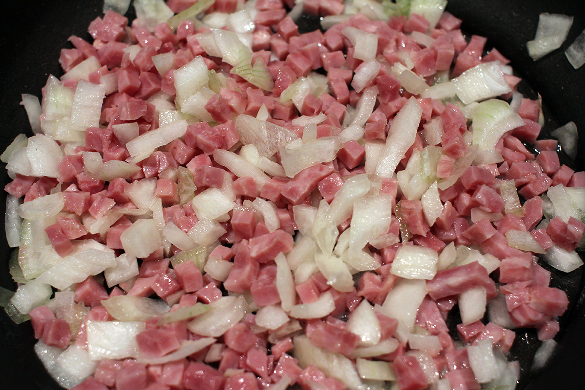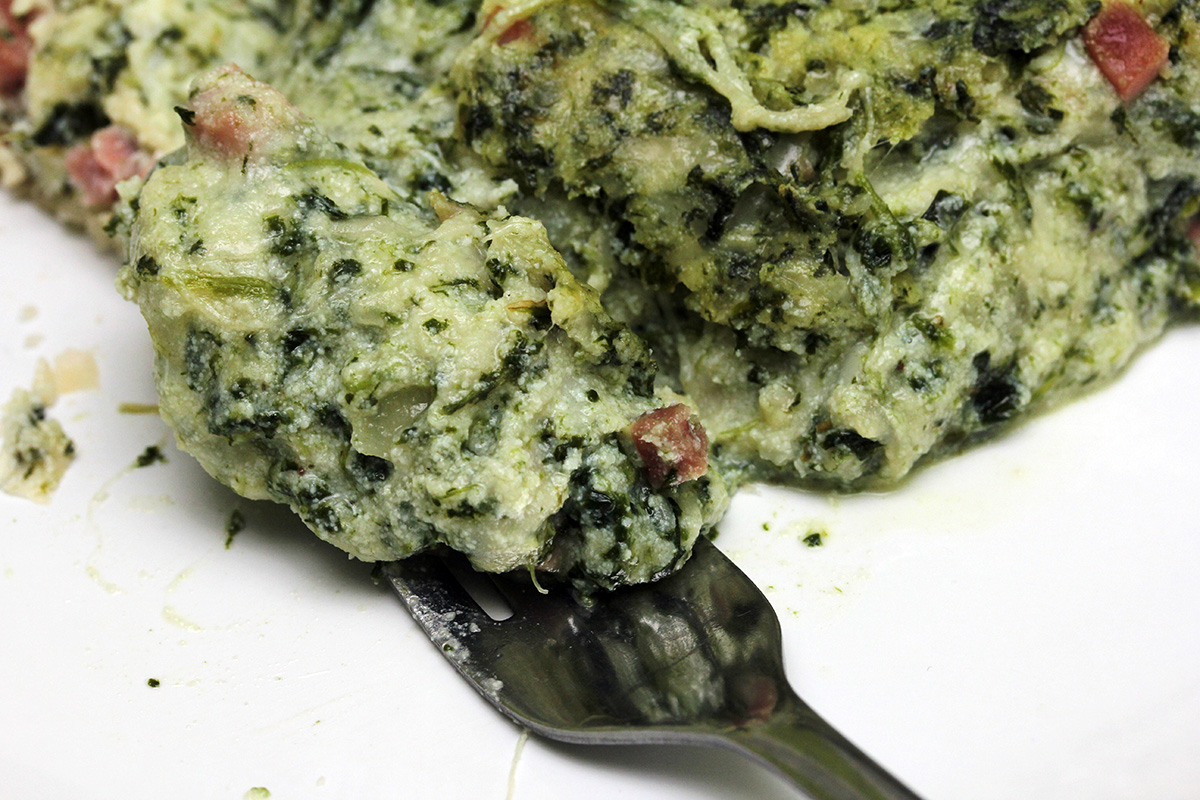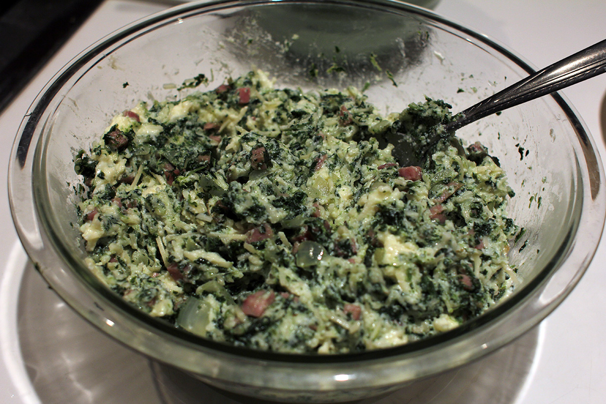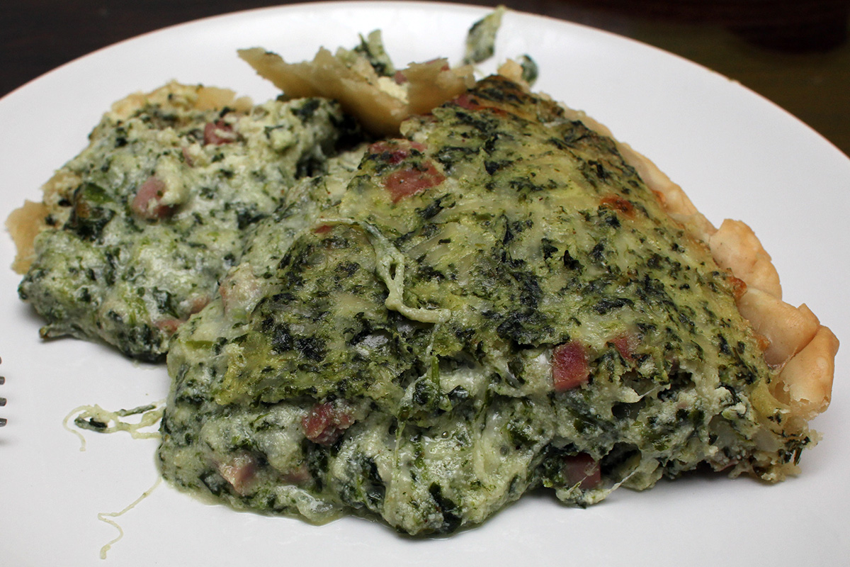 i followed a basic recipe but changed some of the ingredients. as if there wasn't already a lot of proteins, i also like to add some meat to this pie. last time i tried some prosciutto, but that ended up being a waste of perfectly good dry-cured italian ham. i used simple ham this time around, prepackaged and already diced. i used 8 oz. of a mozzarella provolone blend, and 6 oz. of shredded parmesan. i might've added too much parmesan, because the recipe asked for 1 cup (more on that later). the recipe also calls for a dash (1/4 tsp) of nutmeg, which i've never add. i consider nutmeg a sort of dessert spice, and a winter dessert at that. adding it seems unusual, but i had some on hand so i did as directed. it made the sauteed ham onion spinach smell sort of funky, and i was afraid it would ruin the flavor of the quiche.