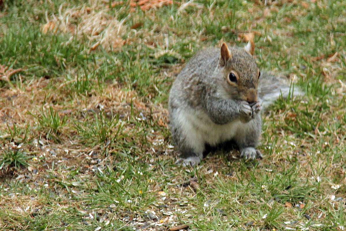 i ran outside hoping to trap it. i didn't think far enough had i actually caught it, but the thought of killing it did cross my mind. but rabbits are smaller than they appear and this one managed to find a surprisingly large hole underneath the eastern fence border. i thought i plugged them all; either i missed one or rabbits dug a new hole. i grabbed some dead leaves and plugged the hole. elsewhere, a squirrel was busy eating some spilled bird seeds.