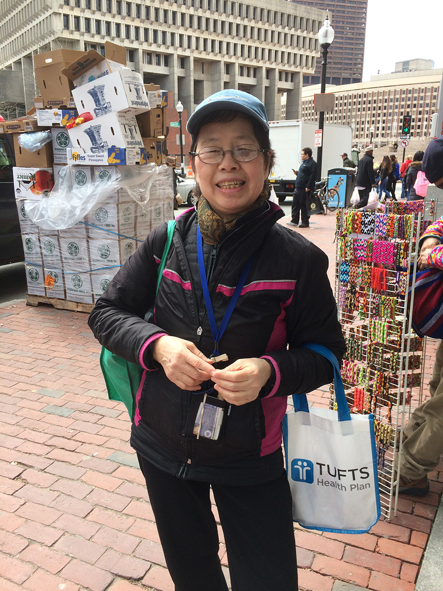 i biked down to boston to quincy market to buy a souvenir boston t-shirt for wangyang. i figured if she couldn't come up to boston, the least i could do is get her some special boston-related gift. i also took a bunch of photos so i could send her, since she's been sending me photos all week. at the very last minute i decided against getting her a boston t-shirt but a harvard one instead when i saw an apparel kiosk. they had t-shirts in women's style but i got her a regular unisex small ($14) just to stay on the safe side. it's not an official harvard university t-shirt, but have you seen the prices for a real one? besides, regardless if it was from the coop or from a pushcart, it's from boston/cambridge, that's what counts. later i checked the tag: i was so afraid it was made in china (that'd be embarrassing), but thankfully it's from the dominican republic.
