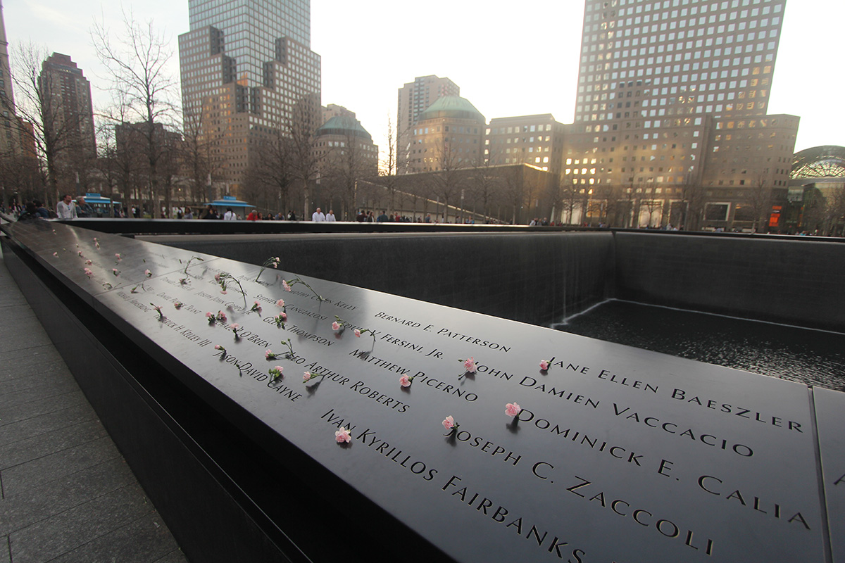 at the memorial, wangyang was impressed with the design. we saw both infinity fountains before leaving. we passed another church, st.paul's chapel, but like the trinity, it too was closed. we walked to city hall park, where we stopped to take a seat and admire the woolworth building, which wasn't much to look at enveloped in renovation scaffolding. it was already a bit after 7pm and the sky was getting dusky. i suggested we walk a bit across the brooklyn bridge to see the city at sunset then grab some indian food for dinner in the east village.