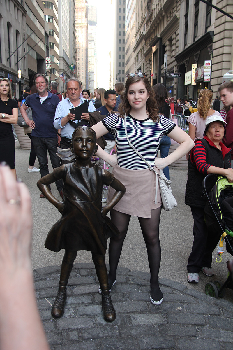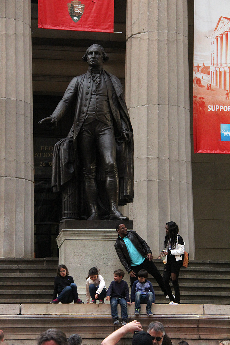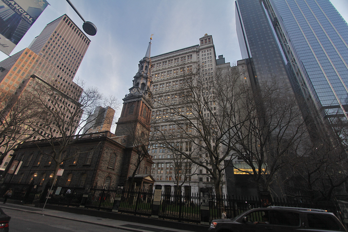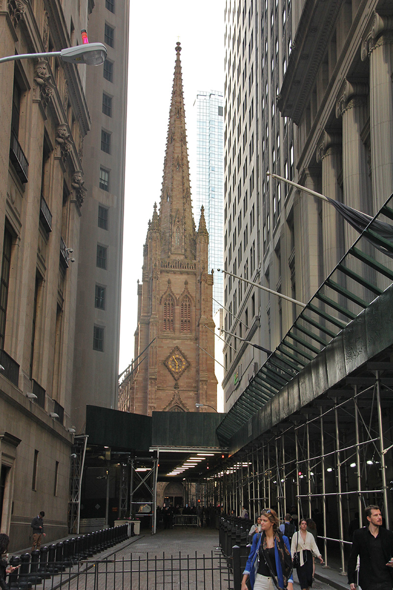 it took us an hour and 10 minutes to get from flushing to bowling green station at the southern tip of manhattan, arriving at 5:20pm. good thing sunset wouldn't be until 7:30pm, giving us 2 hours of daylight to sightsee downtown manhattan. we went to battery park to view the statue of liberty in the harbor. wangyang remarked how small it seems. we left the park and headed towards wall street, passing by the charging bull statue swarming with tourists clamoring to get their photo taken with the famous landmark. i saw the new fearless girl statue. we made our way to the new york stock exchange, and as we came up to wall street, wangyang caught sight of trinity church and excitingly ran to go see it.