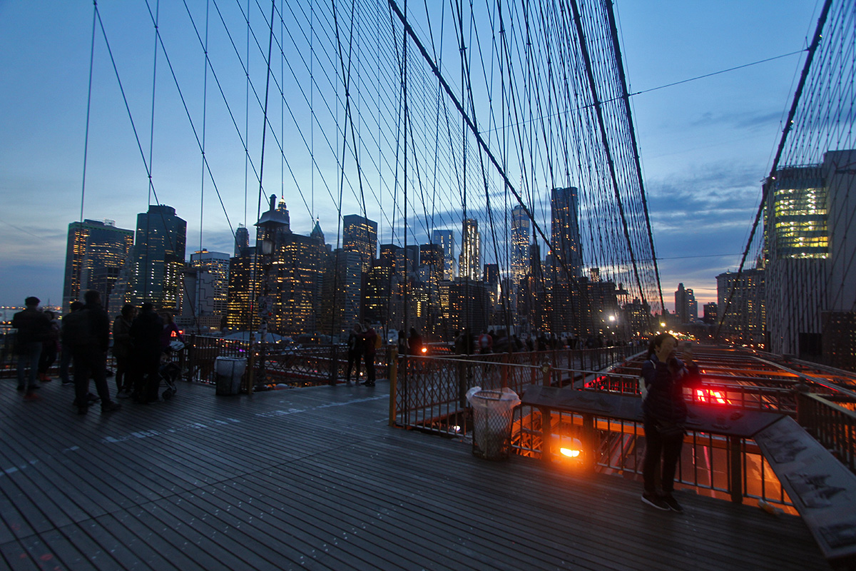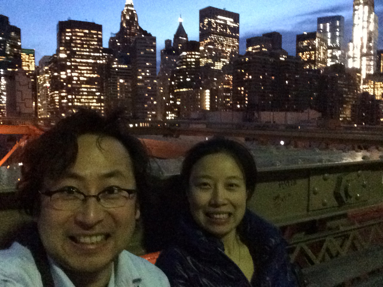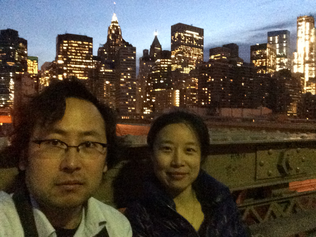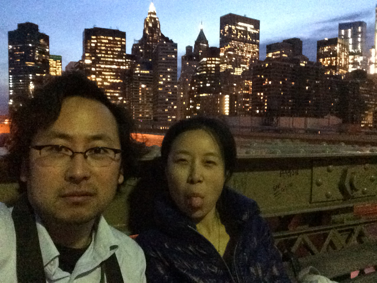 although i didn't plan on it, we got to the bridge around sunset, which is one of the best times to be on the bridge in order to see the manhattan skyline all lit up. i'd actually planned on walking across the bridge as one of our activities, but in hindsight, that would've been an exhausting waste of time, and just walking the bridge partially is plenty good enough for an excellent view. as expected, the bridge was crowded with tourists who had the same idea. tourists and cyclists, who i can only imagine were annoyed with out-of-towners standing in the bike lane (i was guilty of time on a few occasions, but only because the pedestrian walkway was simply too crowded). there were also some hawkers selling new york themes photos and paintings, as well as a resourceful old hispanic lady selling unripened mango slices that wangyang decided to try (crunchy and sour).