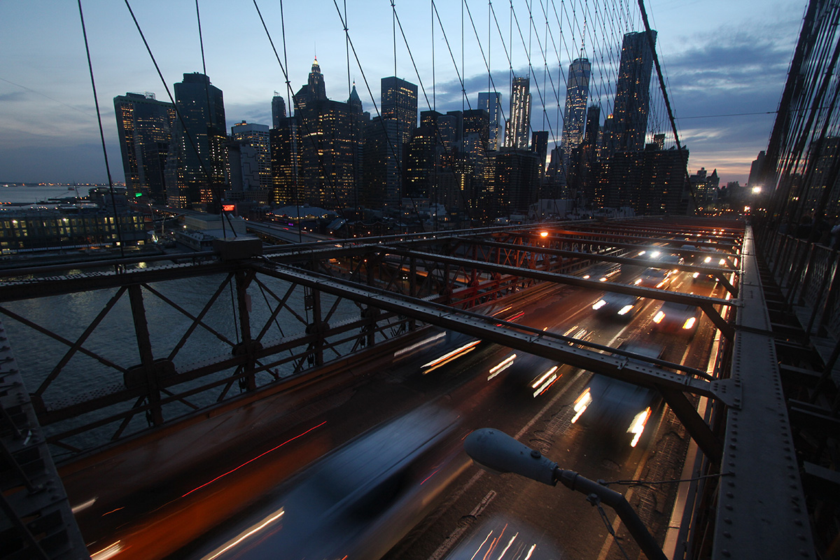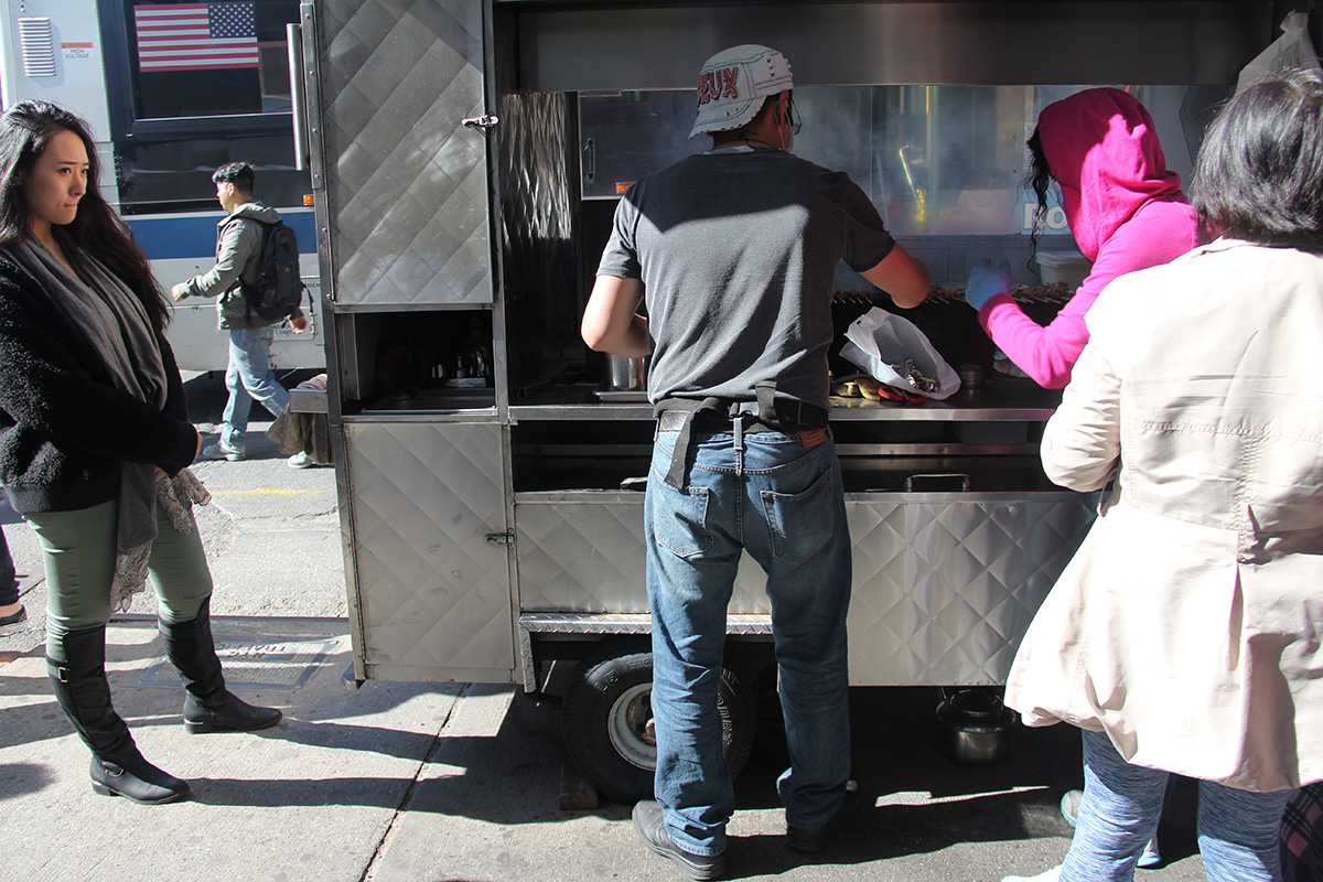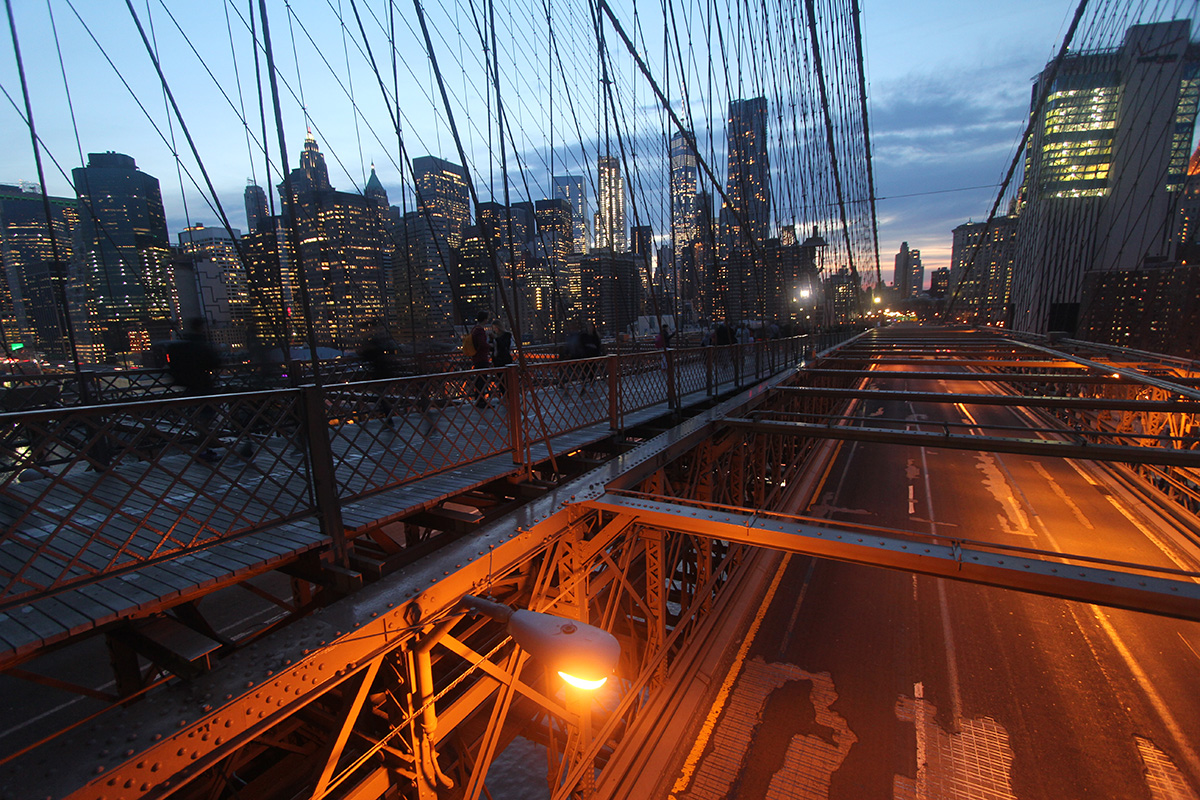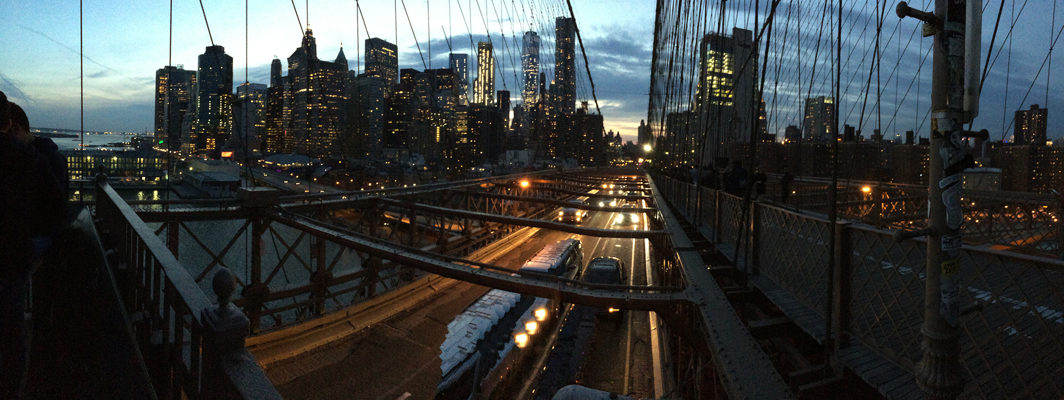 although i didn't plan on it, we got to the bridge around sunset, which is one of the best times to be on the bridge in order to see the manhattan skyline all lit up. i'd actually planned on walking across the bridge as one of our activities, but in hindsight, that would've been an exhausting waste of time, and just walking the bridge partially is plenty good enough for an excellent view. as expected, the bridge was crowded with tourists who had the same idea. tourists and cyclists, who i can only imagine were annoyed with out-of-towners standing in the bike lane (i was guilty of time on a few occasions, but only because the pedestrian walkway was simply too crowded). there were also some hawkers selling new york themes photos and paintings, as well as a resourceful old hispanic lady selling unripened mango slices that wangyang decided to try (crunchy and sour).