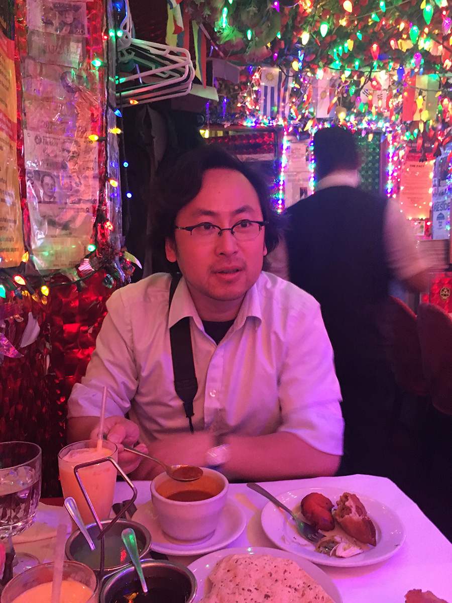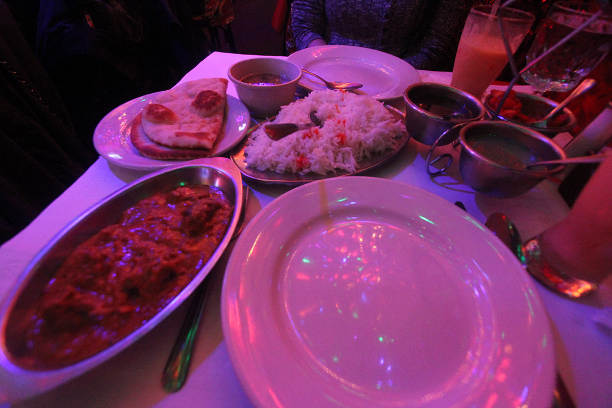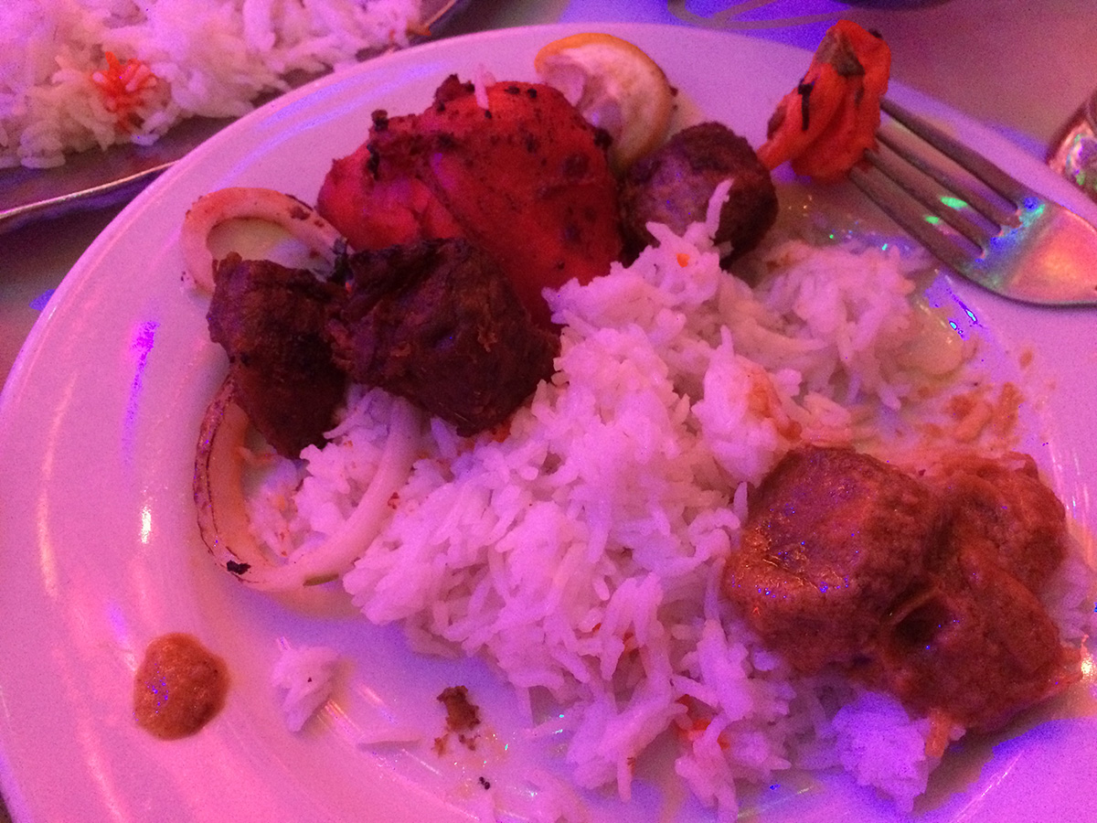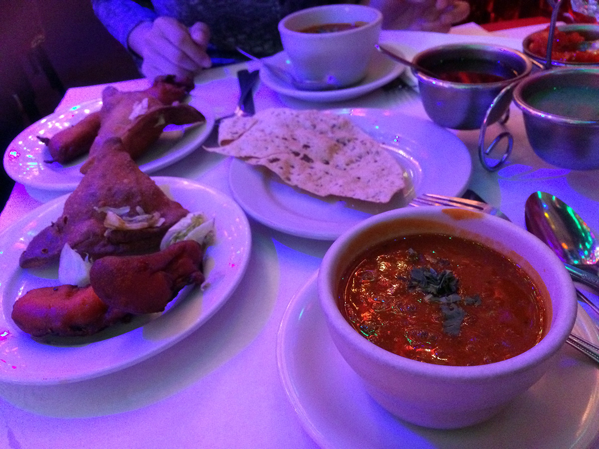 while we waited for our food, we looked at the information taped to the wall. apparently this restaurant was featured in an episode of netflix's daredevil (season 2 episode 5). i ordered the samosas while wangyang got the fried eggplant which tasted so sweet i could've sworn they were sweet potatoes. the soup they delivered was mulligatawny, which i've only heard about but never tried before. it tasted good, but hard to pin-point the exact flavor (as often the cause with indian food which contains a complex spice blend). by that point we were already a little full, and the main course hadn't arrived yet! wangyang got a mixture of barbecued meats while i got a sweet lamb curry that had coconut milk, raisin, and almonds in it. i ate until i was nearly bursting, and couldn't finish everything.