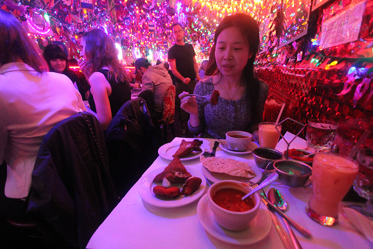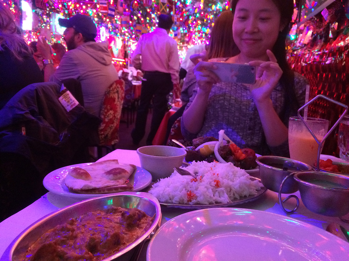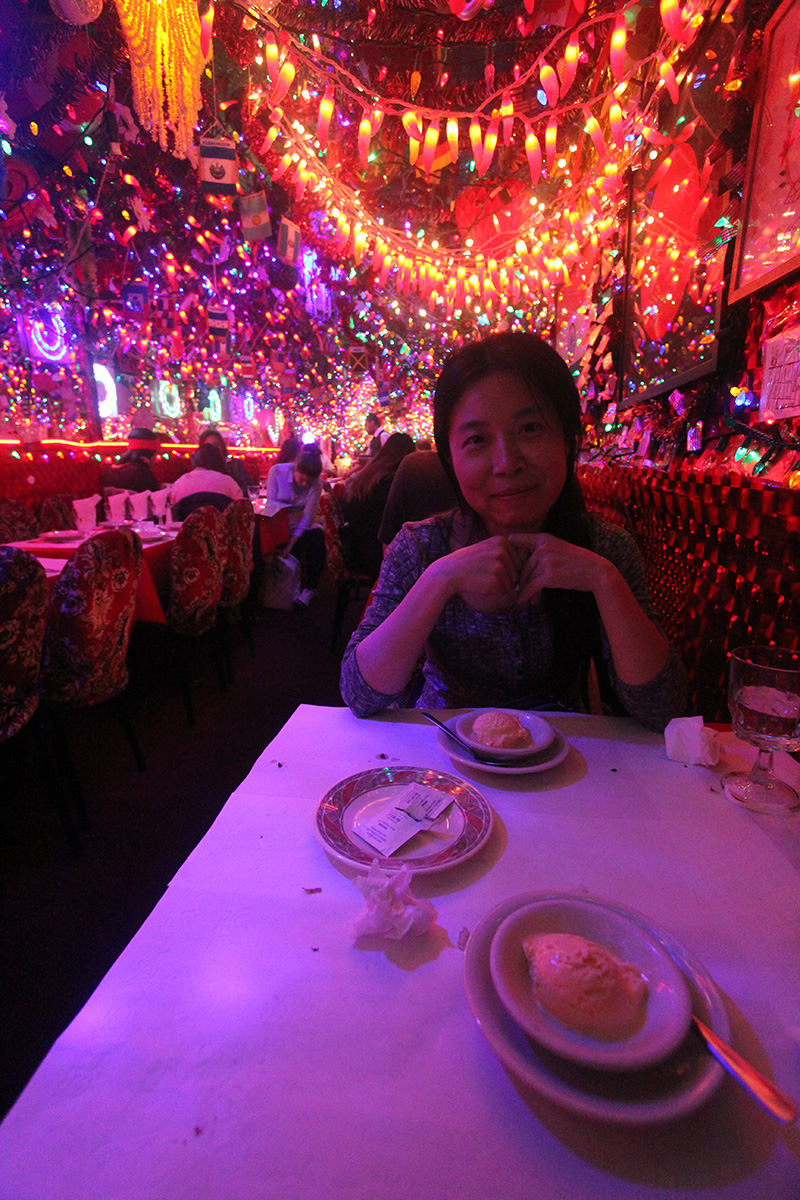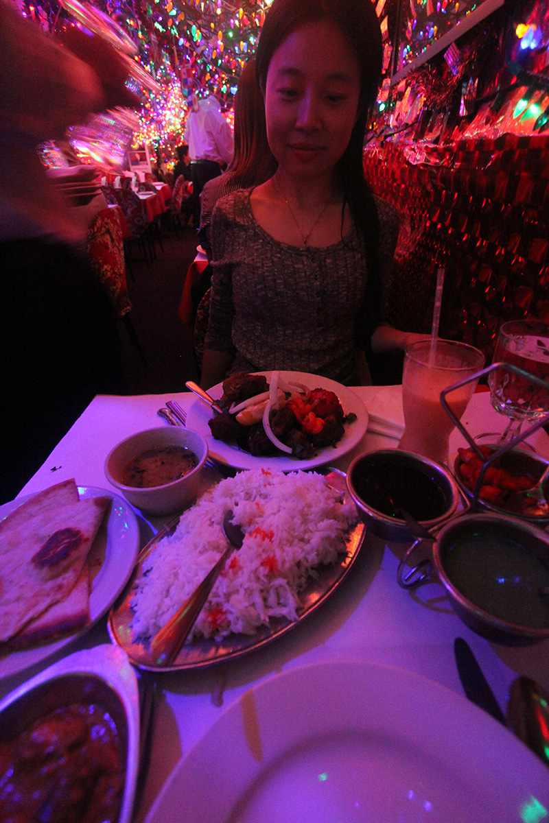 when we arrived at the address for panna II garden an indian man sitting outside a restaurant quickly came out to beckon us into his place. we hesitated, then looked upstairs, where there was another indian restaurant. the different was the upstairs place was packed and simply had more lights. a few indians standing out that restaurant noticed us and beckoned us to come upstairs to their place. turns out the upstairs restaurant is the real panna II garden and the one downstairs is just a copycat trying to cash in on the former's success. though the place was crowded, we managed to get one of the last remaining tables at the far end of the restaurant, after walking through a dazzling gauntlet of hanging christmas lights enhanced by wall mirrors and reflective panels. it was like being inside an indian kaleidoscope.