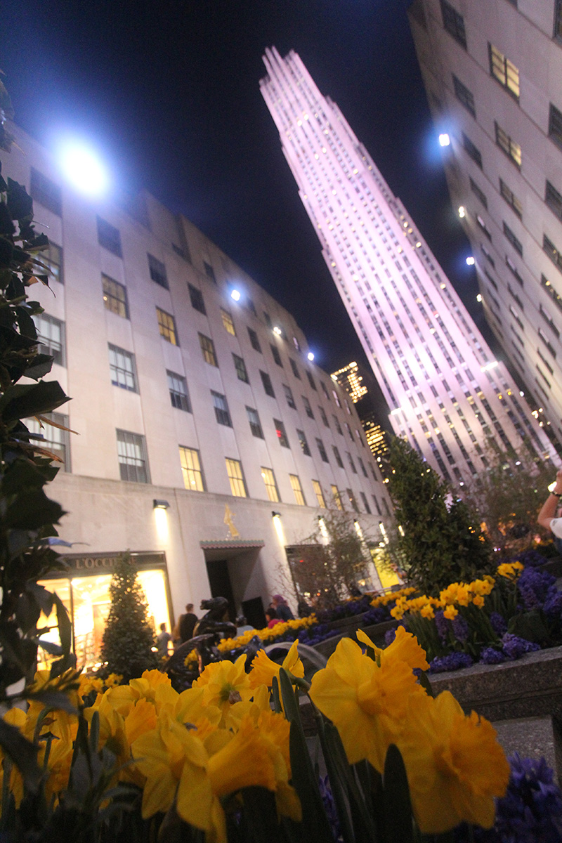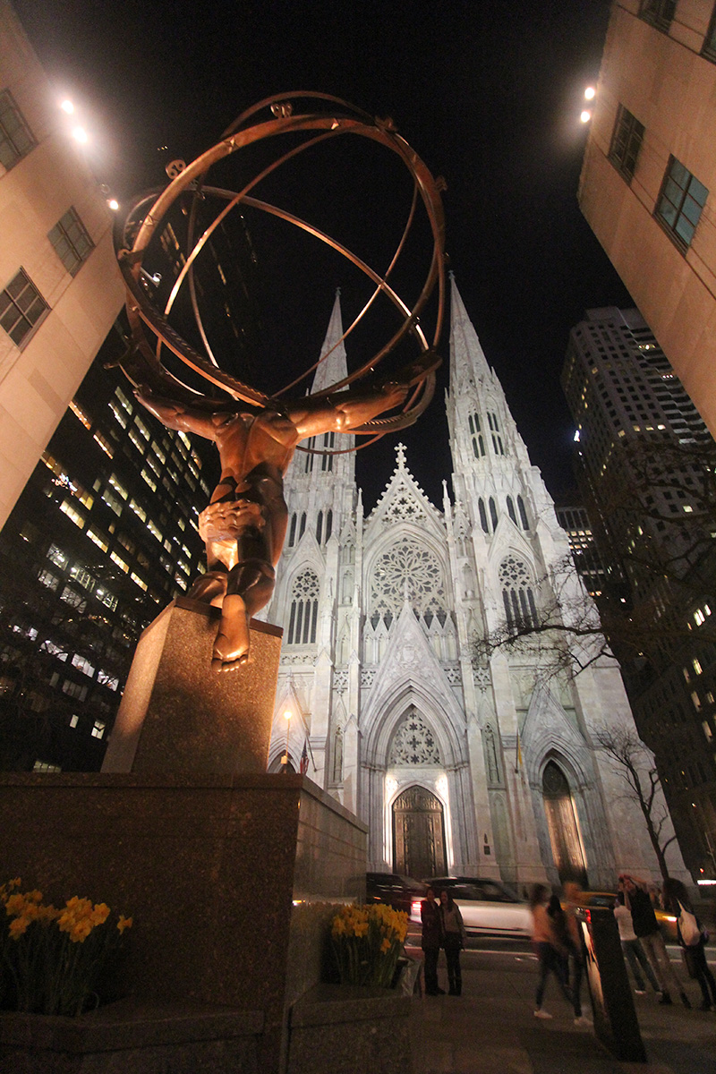 we went to rockefeller center. not having enough time to browse the underground mall and figuring they were probably closed anyway, we stopped to admire the freshly planted yellow daffodils and purple hyacinths. the ice skating rink was still operating, despite the 70's temperature (the ice looked more like slush). we continued on our way up 5th avenue, passing by the atlas statue. wangyang took a great photo, juxtapositioning the statue with the cathedral in the background; she has a real eye for photography, too bad she didn't bring her good camera!