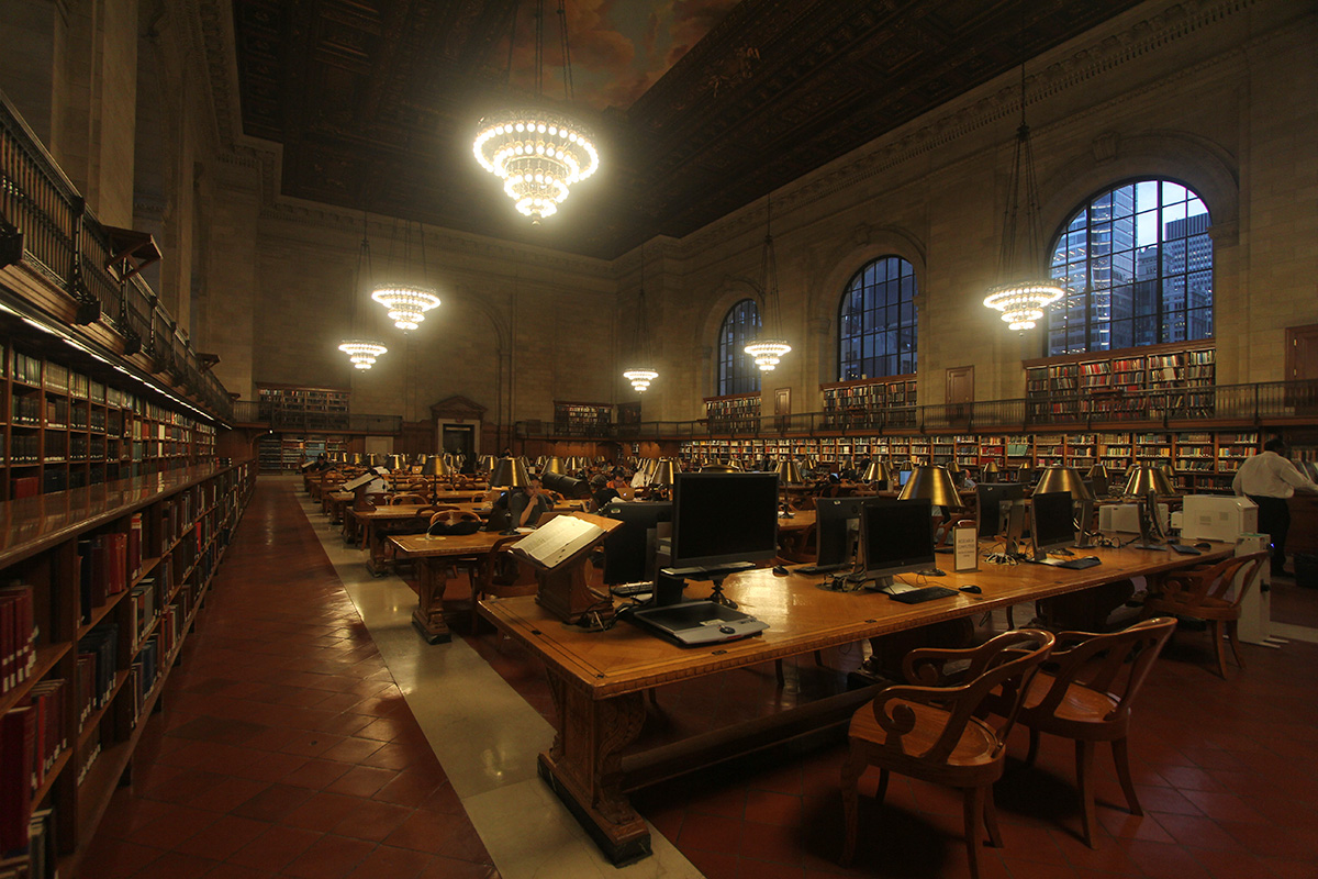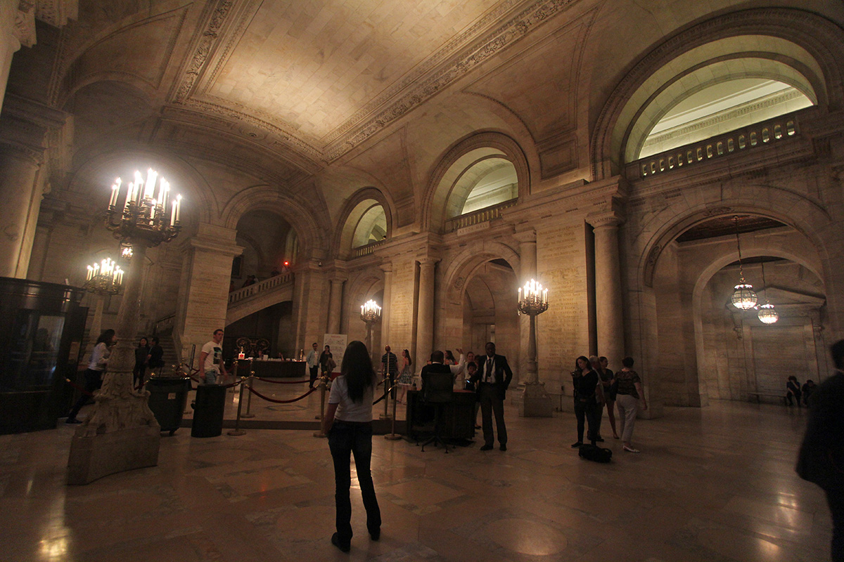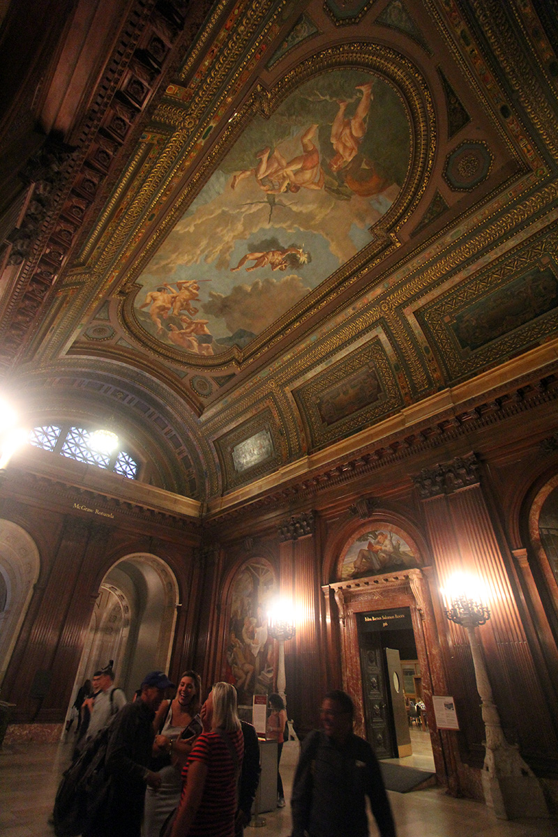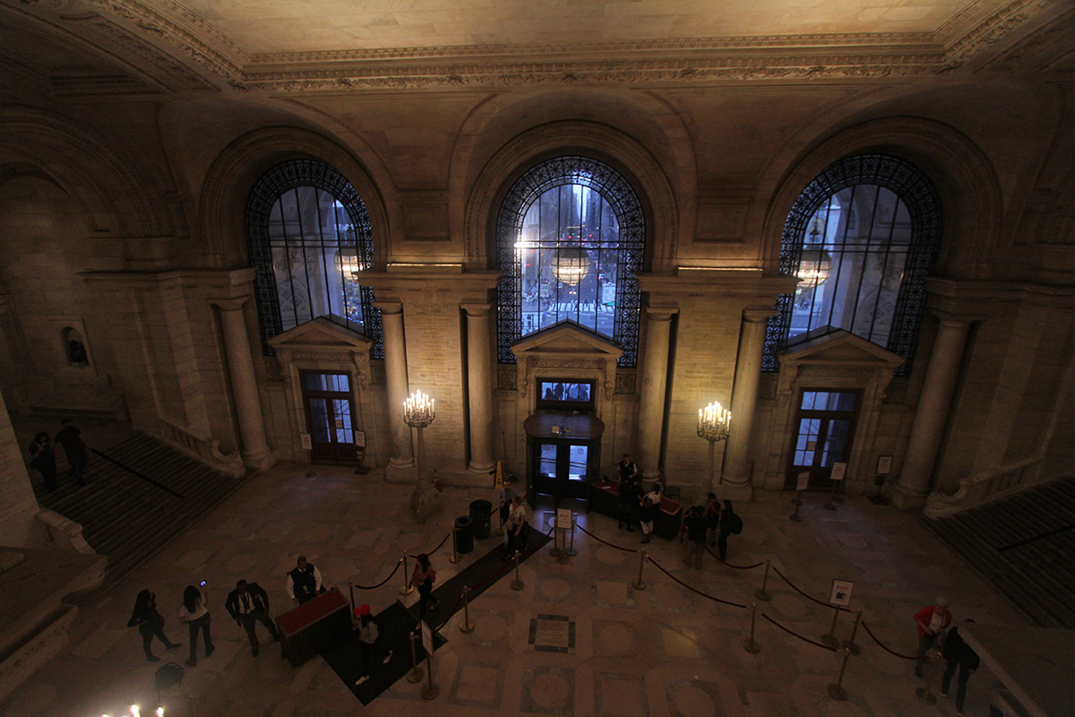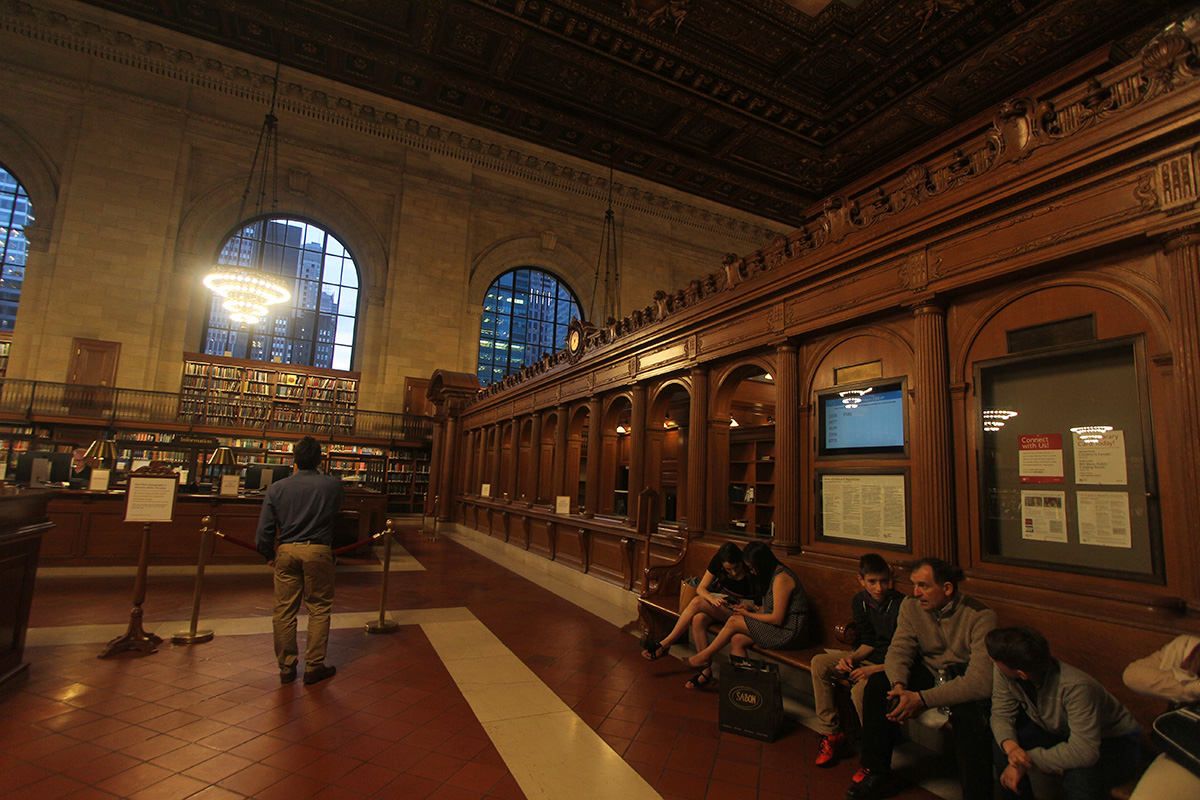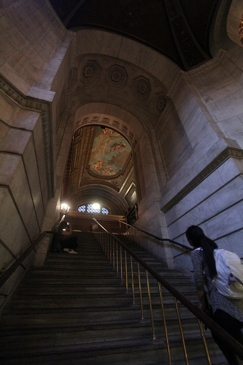 we were at the new york public library for half an hour. that's when i discovered that besides churches, wangyang is also interested in libraries, especially seeing the books. she told me back when she was in changshou, she spent many sundays at the town library doing work (while i was out in chongqing exploring the city). but nowadays big libraries like these don't carry a lot of books. but we kept wandering further and further into the library until we got to the circulation desk area with walls of reference books. she was curious to see what was inside and took one of the books and flipped through its pages, which weren't very exciting.