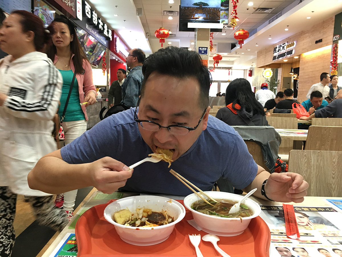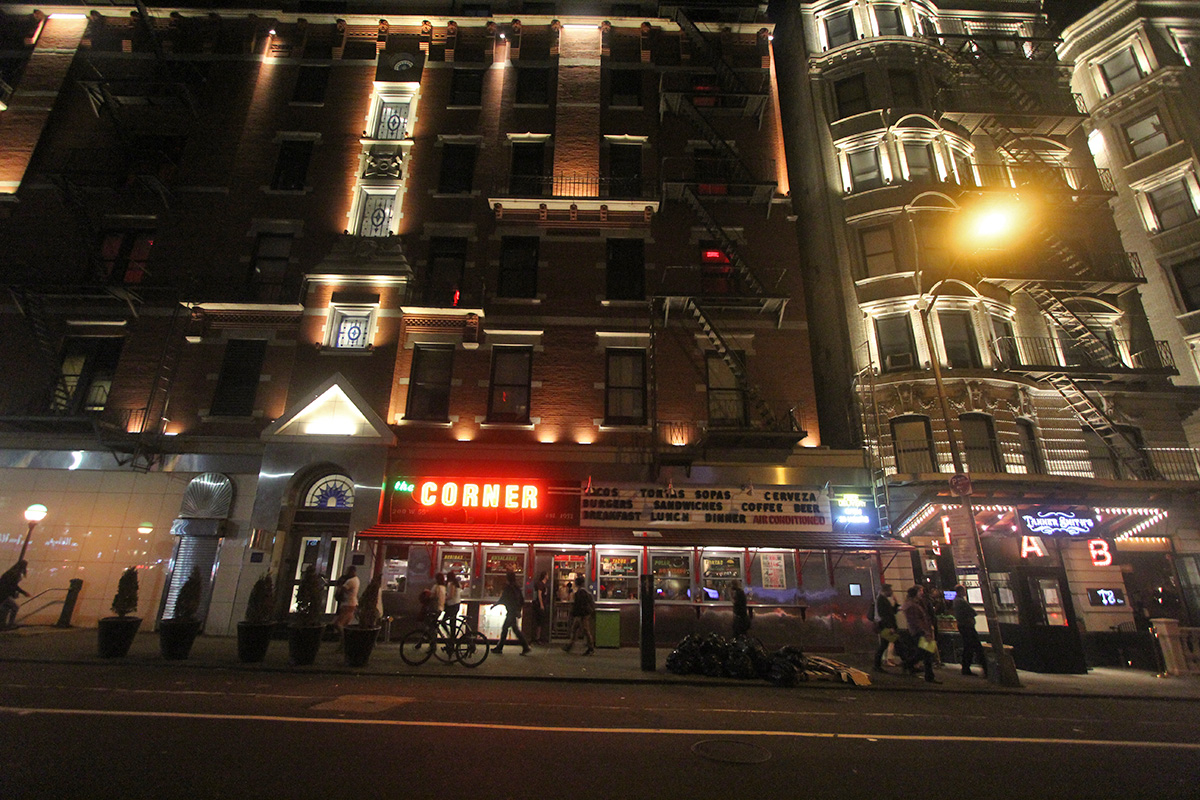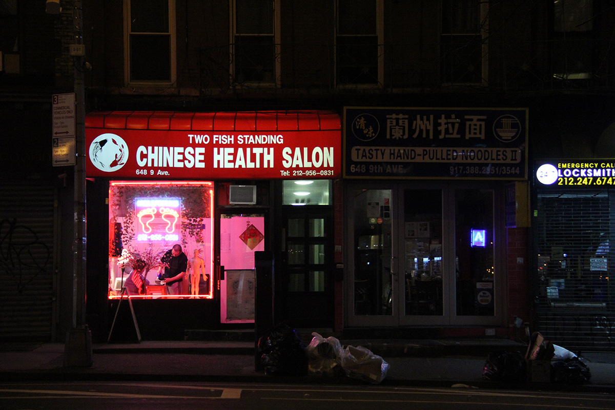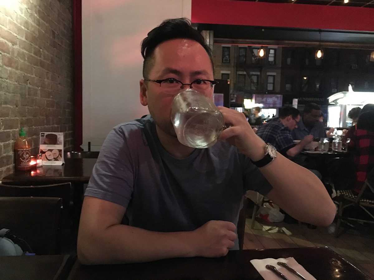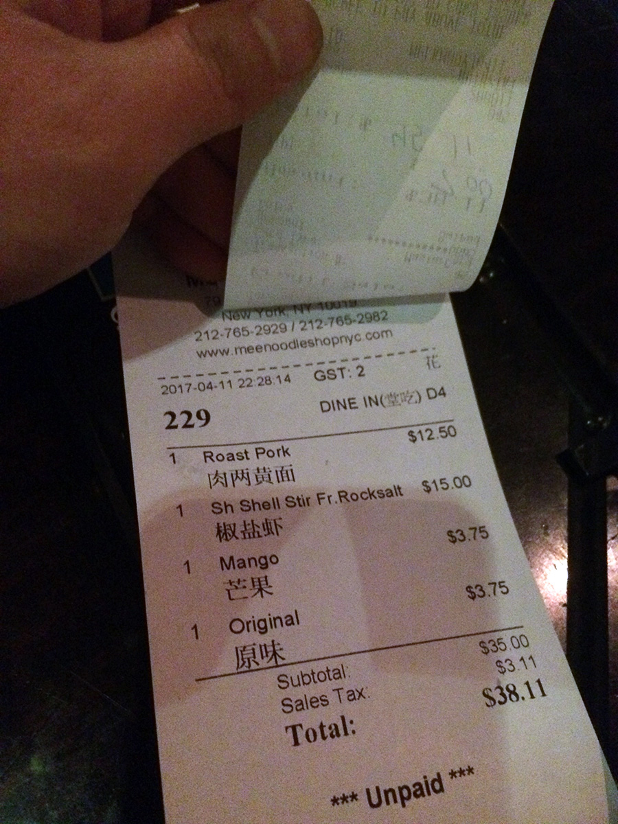 we continued on our way to 9th avenue traveling west on 55th street. once we arrived we started seeing all sorts of places to eat, in case uncle nick's doesn't pan out. when we finally got to the greek restaurant (a bit after 10pm), the doors were already locked despite there being people inside still eating (the restaurant doesn't close until 11pm). another couple wanted to eat there too and was dismayed they were closed. "we can all this way out just to eat here," the guy said. buddy, if you only knew only far we traveled to come here! fortunately there were other restaurants, but it seemed like the choices were either thai or indian, both foods wangyang has tried before. as it was getting late and we were both hungry, we finally settled on mee noodle shop, which looked like a fancy noodle specialty restaurant.