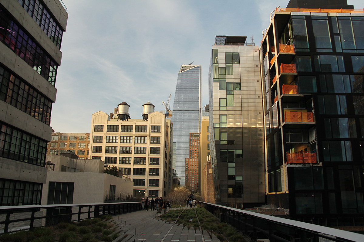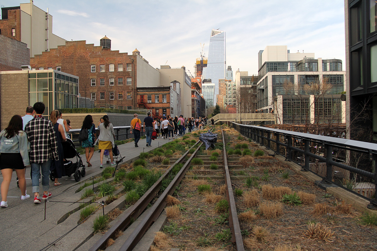 we made it to the high line by 5:50pm. the meatpacking district was full of trendy restaurants full of people just getting off of work drinking and eating al fresco. we walked behind a trio of typical new york millennials (white guy in shorts and sunglasses, a pretty girl in a dress, and a black guy holding a small dog) but they were denied entry by the park rangers because dogs aren't allowed. the high line was crowded, which seemed unusual for a late tuesday afternoon. the last time i came there was hardly any people, but it was also cold so that might've made a difference. today's unusually hot with temperature somewhere in the 80's and probably a lot of tourists gathered there to see the sunset (although not worth it in my opinion, with the shores of new jersey as a backdrop).
