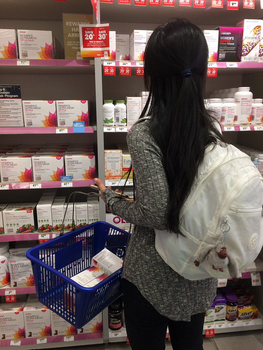 on our way back to the hotel to drop everything off (i helped wangyang carry her suitcase, i didn't want to ruin the wheels by rolling it), we stopped by another GNC store on main street. wangyang decided to buy her vitamins here, saving herself a trip back to the mall. most of the young salespeople in the store were chinese-speaking, but the manager seemed to be an older indian woman,