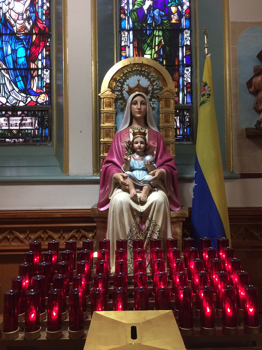 we didn't arrive at 14th and 8th until 5:25pm. there were also places to see to our east (union square, strands bookstore, flatiron building) but we just didn't have enough time. we walked down 14th avenue through chelsea, with the high line within view on the horizon. there were a lot of gyros shops and i told wangyang we'd have time to try it because she's never had it before (nor greek food for that matter). we just so happened to pass by an old church - santuario de ntra. señora de guadalupe en san bernardo - and decided to take a peek inside, since wangyang love old churches. the santuario did not disappoint, the inside all dark and tall and painted in a moss green color. a few worshippers dotted the pews, the only sounds came from a man solemnly singing in latin in a corner. this was no tourist trap, but rather a functioning neighborhood church with real devote worshippers. we walked half the perimeter, wangyang speaking in a soft respectful whisper i could barely hear. instead of real candles, the church used electronic candles at its altars, turned on by buttons after paying the suggested donation.