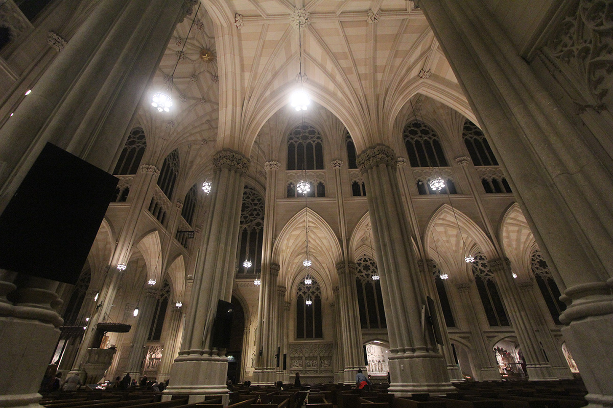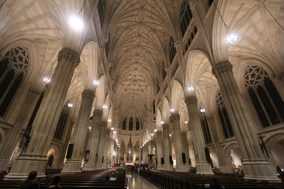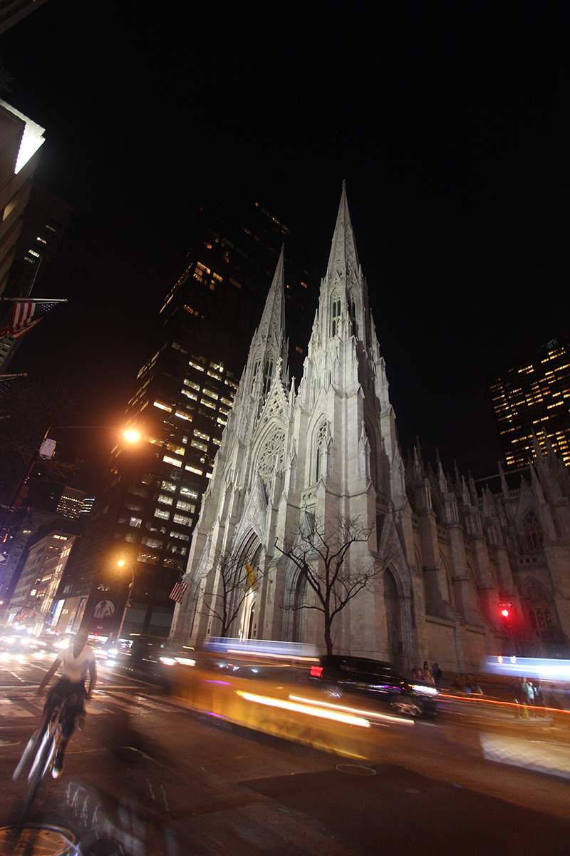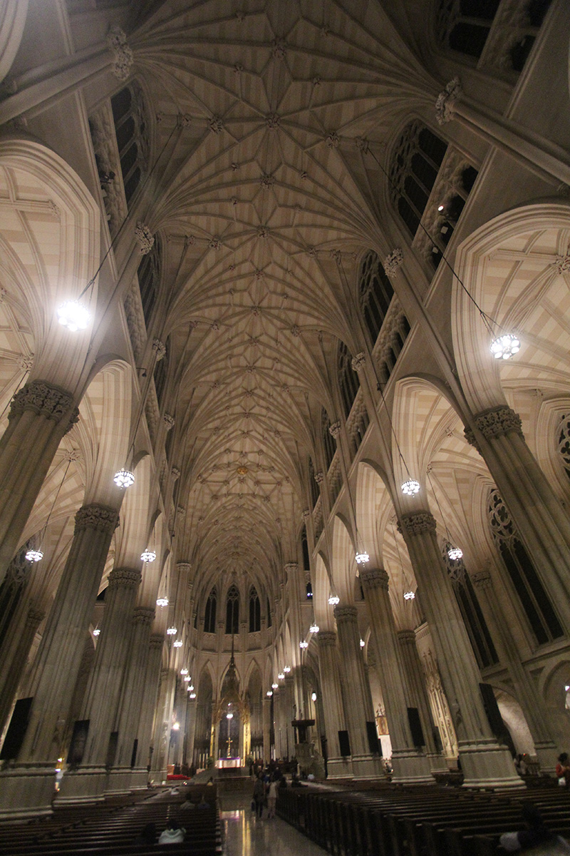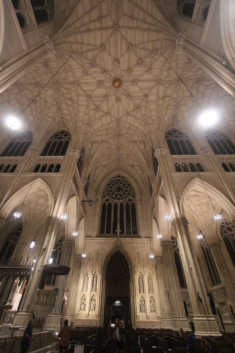 when we got to 50th street i had a surprise waiting for wangyang which she wasn't expecting: st.patrick's cathedral! as it turned out, they were still opened despite it being 8pm (they're actually opened until 9pm). wangyang's energy level perked right back up as we made our way through the security check and into the church. she was impressed with the inside, and found it comparable to some of the european churches she's seen. we found an empty pew near the front of the church to sit so she could rest and admire the interior. it was different than the chelsea church we saw earlier, this one was more touristy (being on 5th avenue helps).