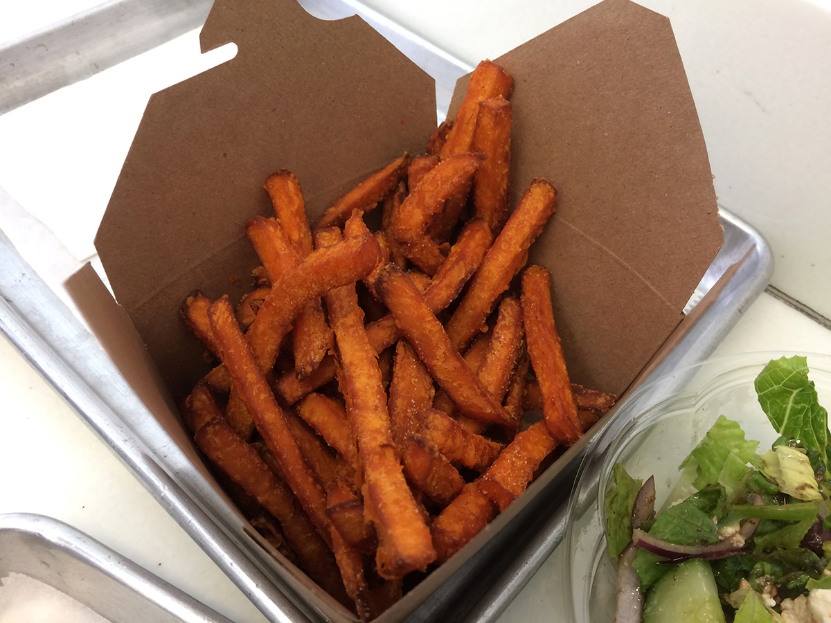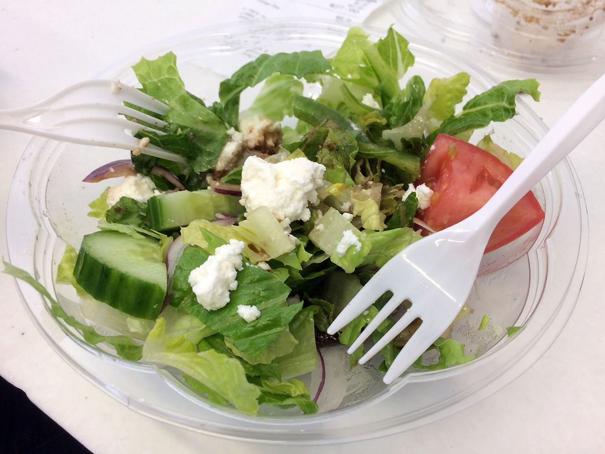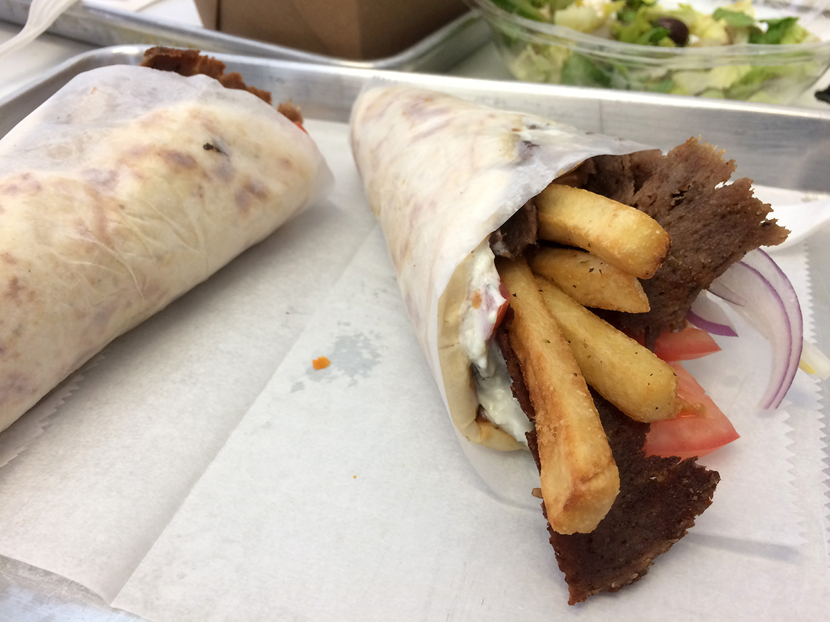 it took us 10 minutes to walk to mamaygro, by the time we arrived it was already 3pm. what i thought was a sit-down restaurant was more of a takeout place with a countertop with 4 barstools. fortunately it was the middle of the day so the limited seats were empty so we decided to give the place a try. wangyang wanted to try a greek salad (which is just a plain salad with feta cheese and some sort of greek vinaigrette dressing). i ordered 2 lamb gyros with tzatziki sauce, and an order of sweet potato fries. later we got 2 greek drinks (like a greek version of carbonated orangina without the pulp). the food was pretty good, probably more high end that the typical gyro you'd find in a sub shop. the gyros came rolled up in a cone stuffed with regular fries and seemed small at first, but it was pretty filling and i don't think i could've eaten anymore. the sweet potato fries were really good too, like they were made to order and not just sitting around under a heat lamp.
