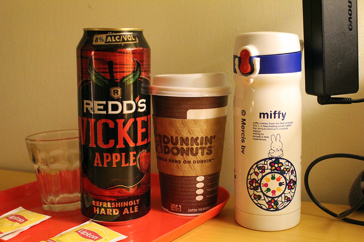 the super market turned out to be the new world mall. it was a bit past 10pm but i was surprised they were still opened (if not, i knew at least one other liquor store nearby, although not sure if they'd be open), with a few people casually shopping inside. i'd never seen the place so empty, since normally when i come the place is packed. they had some hard cider but they came in packs. the only single serving was a large can of redd's whicked apple ale. i bought that and some fishsnacks and we returned to the hotel.