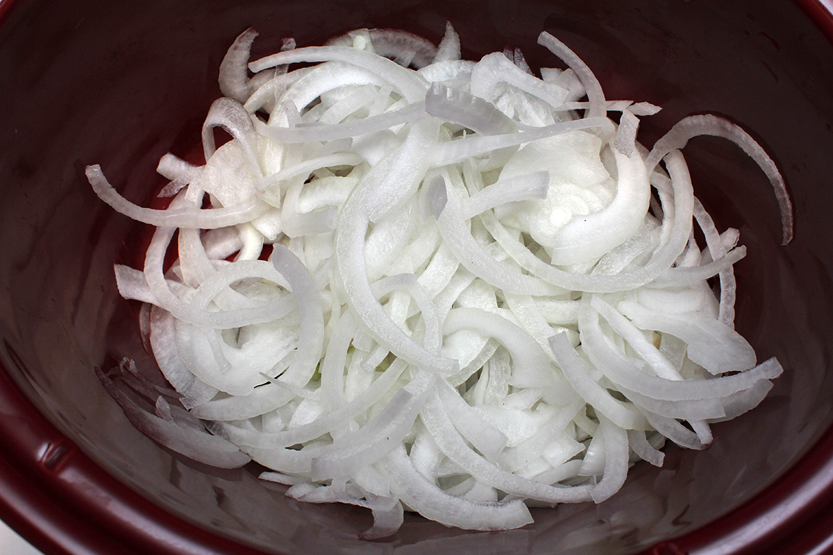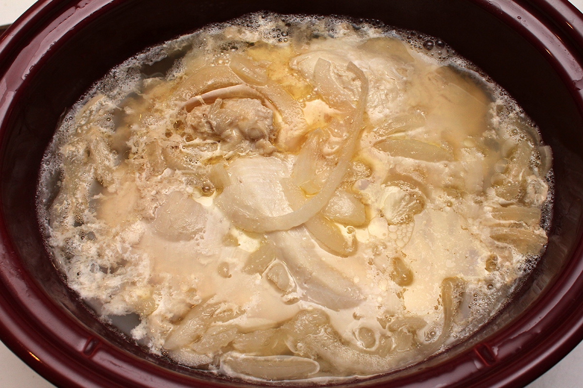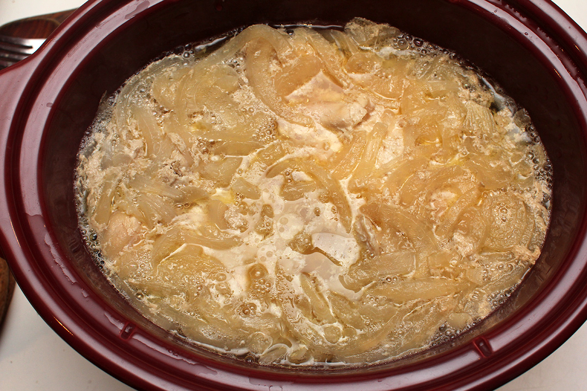 there aren't too much ingredients: chicken breast, onion, chicken stock. i had some liquid smoke (purchased back in 2010 for my beef jerky recipe) and various unopened bottles of barbecue sauce in the cupboard. i researched recipes but none of were to my exact liking so i combined a few. one recipe slow-cooked the chicken in the barbecue sauce, but i found in my experience that juices from the cooked meat will dilute the sauce and make it bland; better to add the sauce at the very end. another recipe used chicken stock instead of water for a tastier chicken; i didn't have enough stock to cover everything so i added a cup of water to make up the difference. a third recipe suggested the chopped onions addition. i wonder if i should add some salt, but hopefully the bbq sauce will provide the flavor. i will let everything slow cook (on the low setting) for the next 6 hours.
