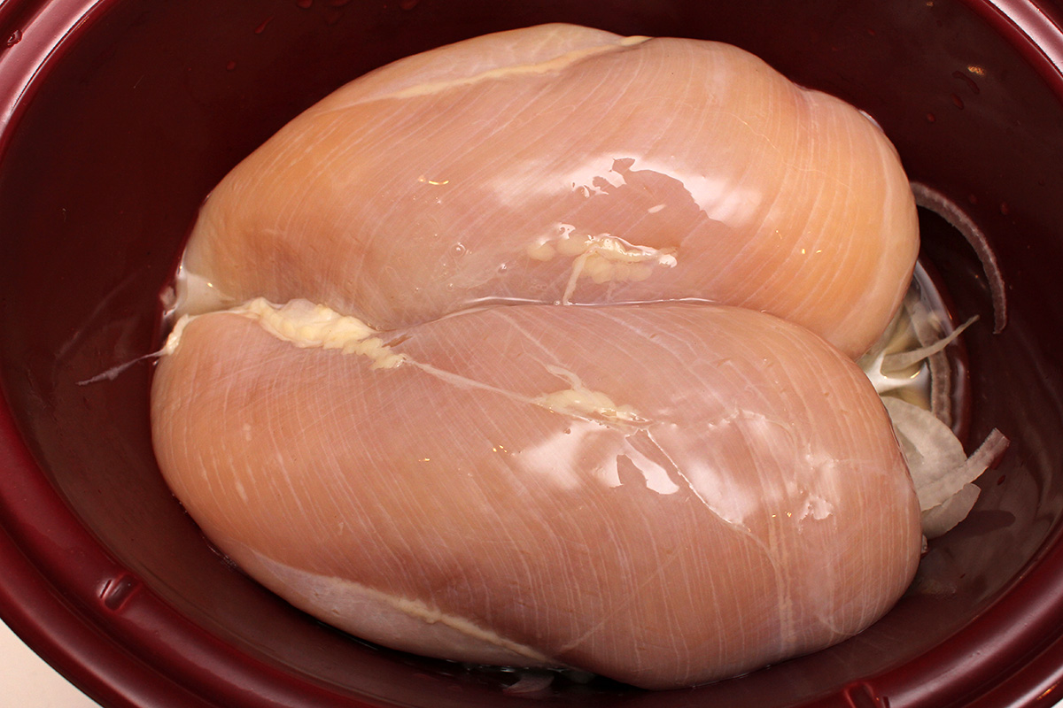 3.3 lbs. chicken breast 1 vidalia onion, chopped 1 can of chicken stock 1 cup of water |