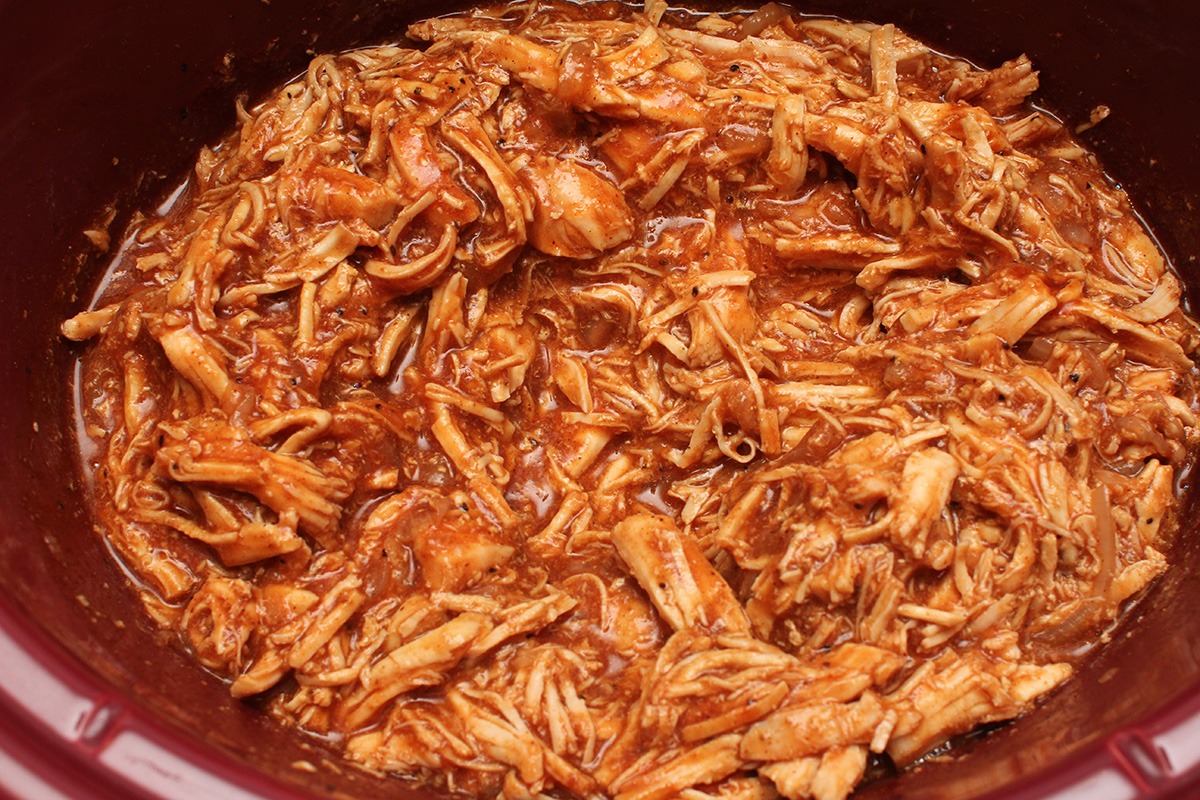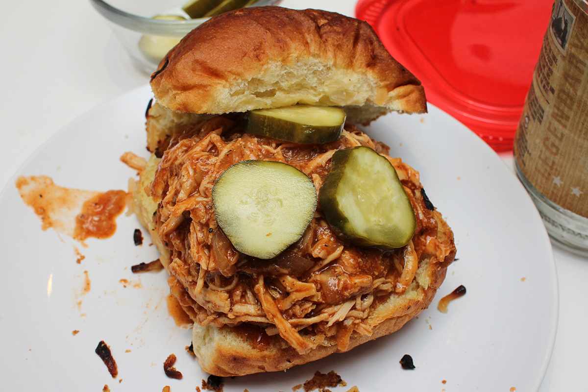 the pulled chicken was okay. the sauce was a bit tangy, and the chicken was a little soupy. maybe if it had more time to slow-cook it could get drier, but i also added half a cup of broth earlier which wasn't necessary. if i make this recipe again, i'll try a different barbecue sauce next time (or even make my own, with a stronger flavor).