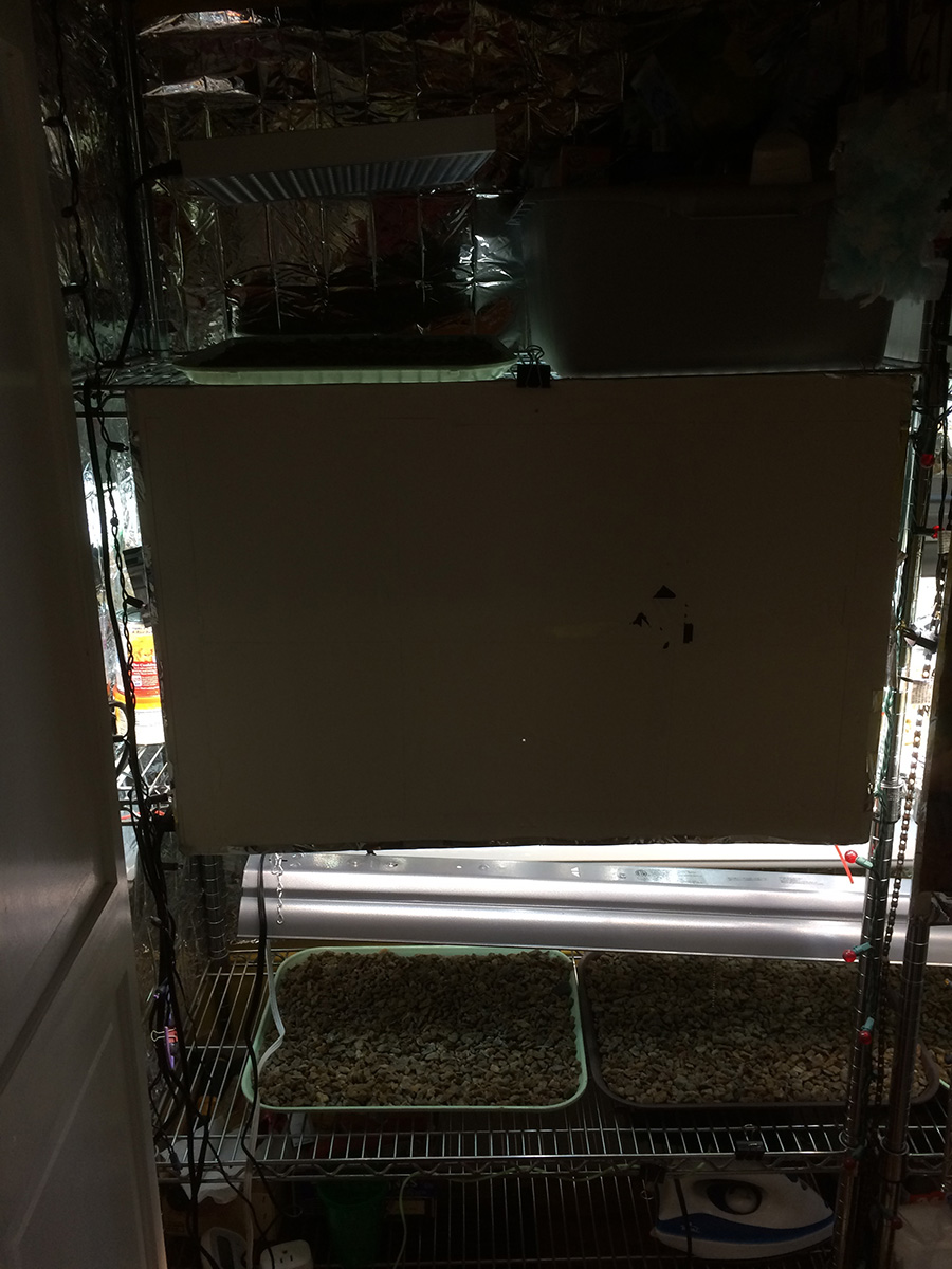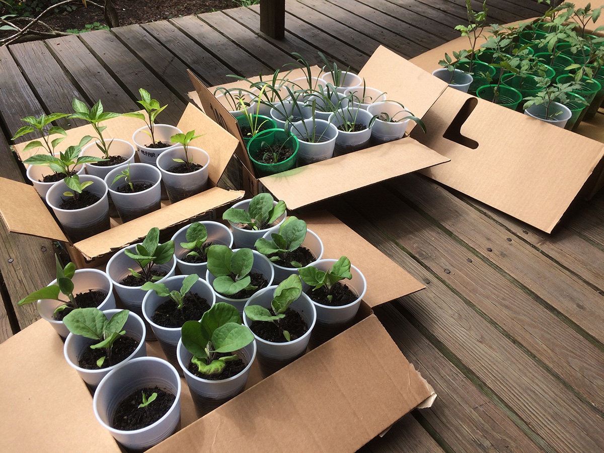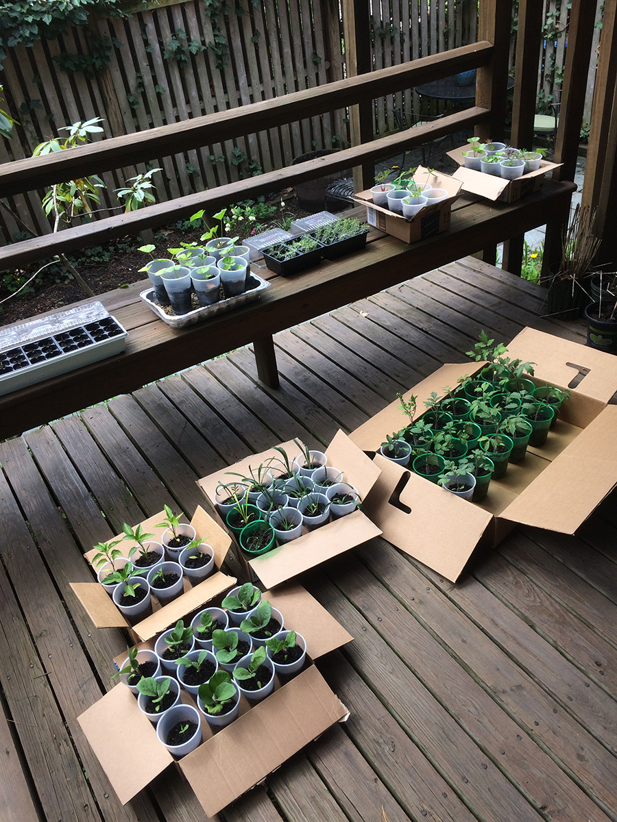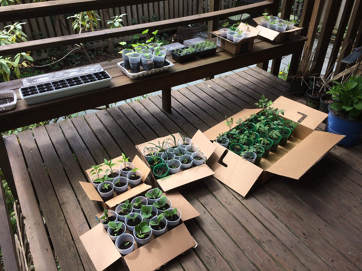temperature today was expected to reach the 80's, so it was a good day to move most of my plants outside, to let them soak up some real sunshine, get some fresh air, and get used to the outside. the oak tree in the backyard hasn't fully leafed out yet, so my back porch gets plenty of sun for the time being. even the weakest of sunlight is probably better than the artificial lights of the closet. the only reason why i didn't put them all out was i ran out of boxes. i reduced the grow closet to just a single shelf now (2 rows of lights). judging from the weather and depending on how i prepare the gardens, i expect to plant at least some of them sometime next week.