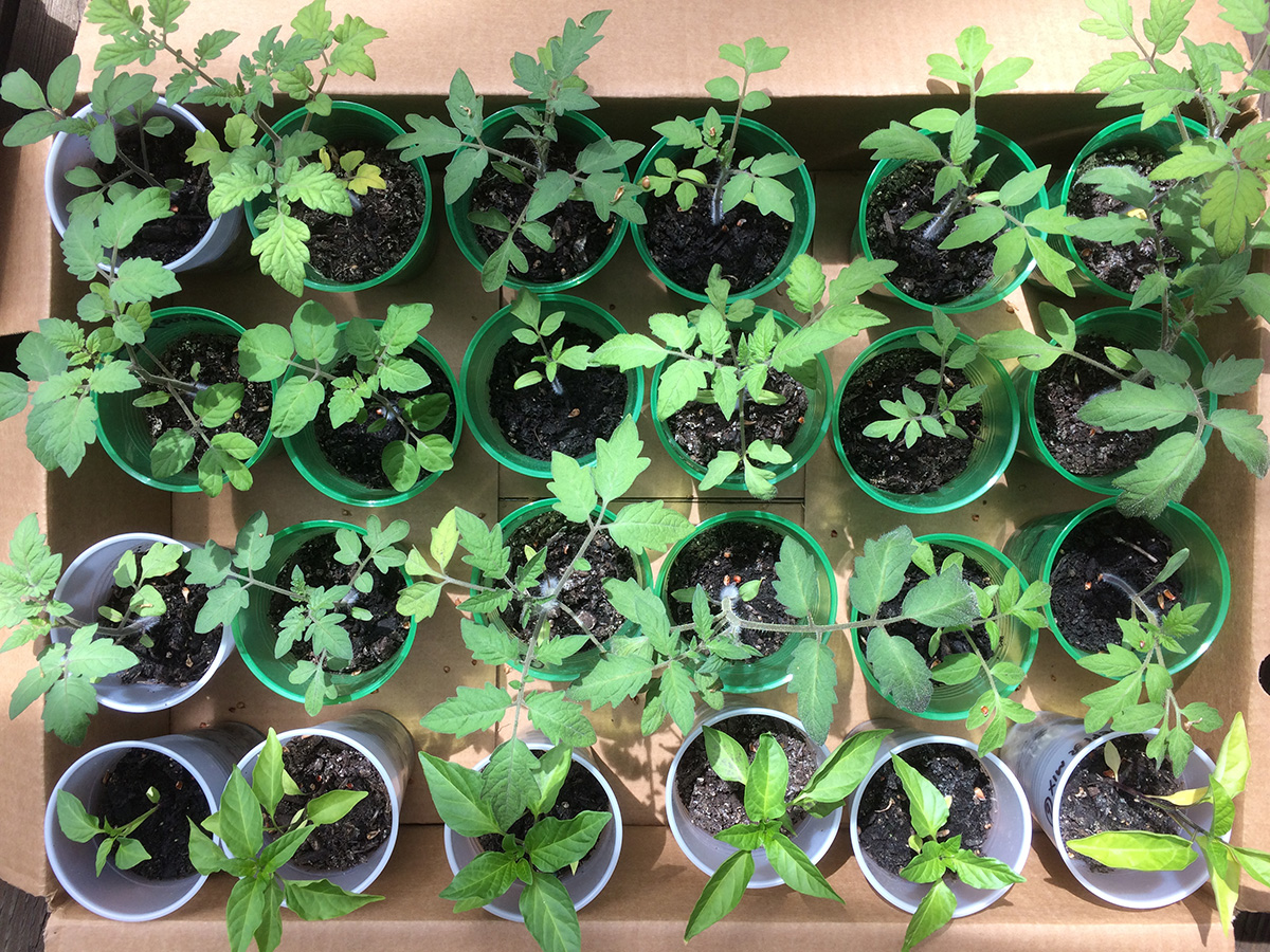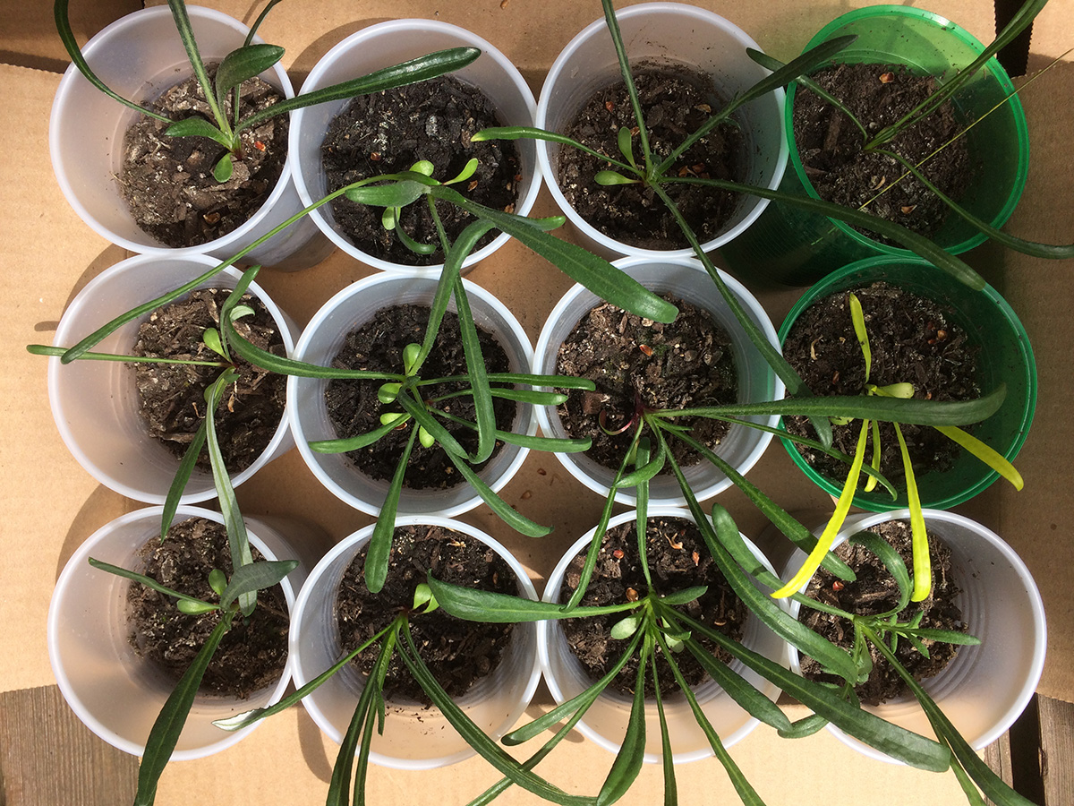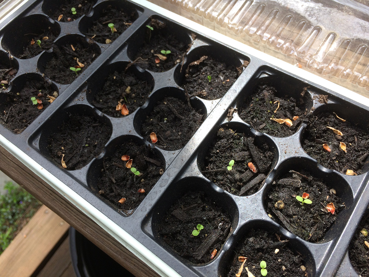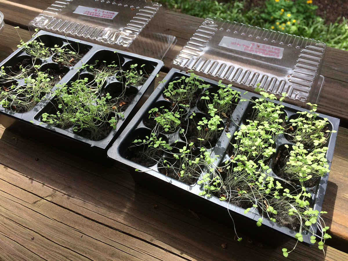 i left a bunch of seedlings out on the backyard porch last night, as the temperature wouldn't dip below 60°F. this morning they got a full dose of sunshine and warmth, as the temperature rose to 84°F, a degree shy of the 1974 record high. i watered a few that looked thirsty and put them back into their boxes.