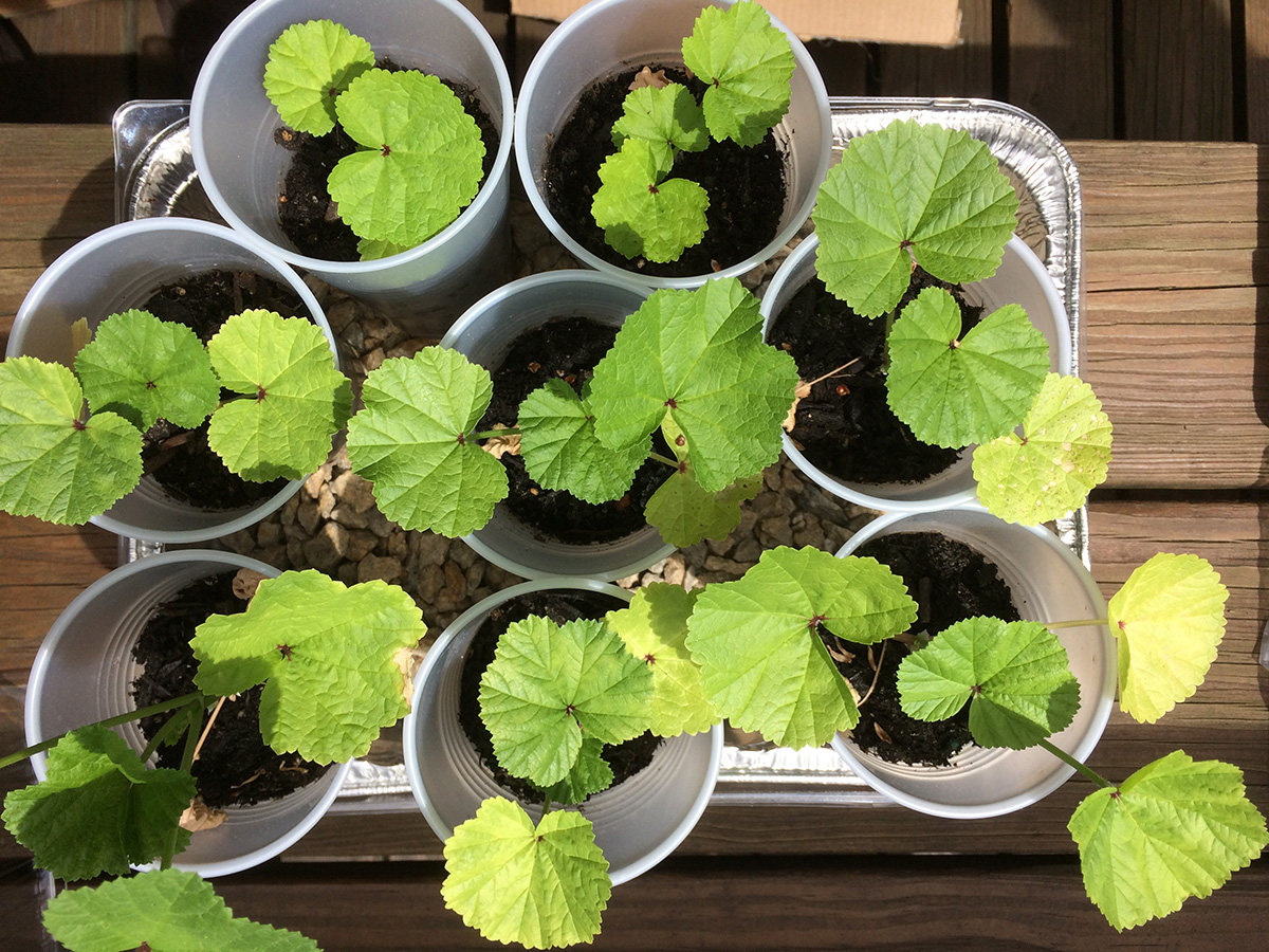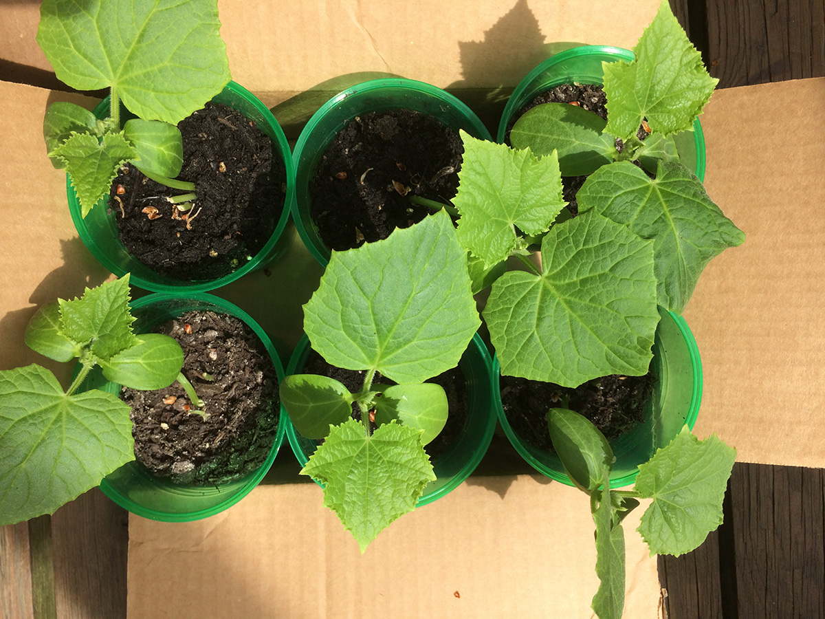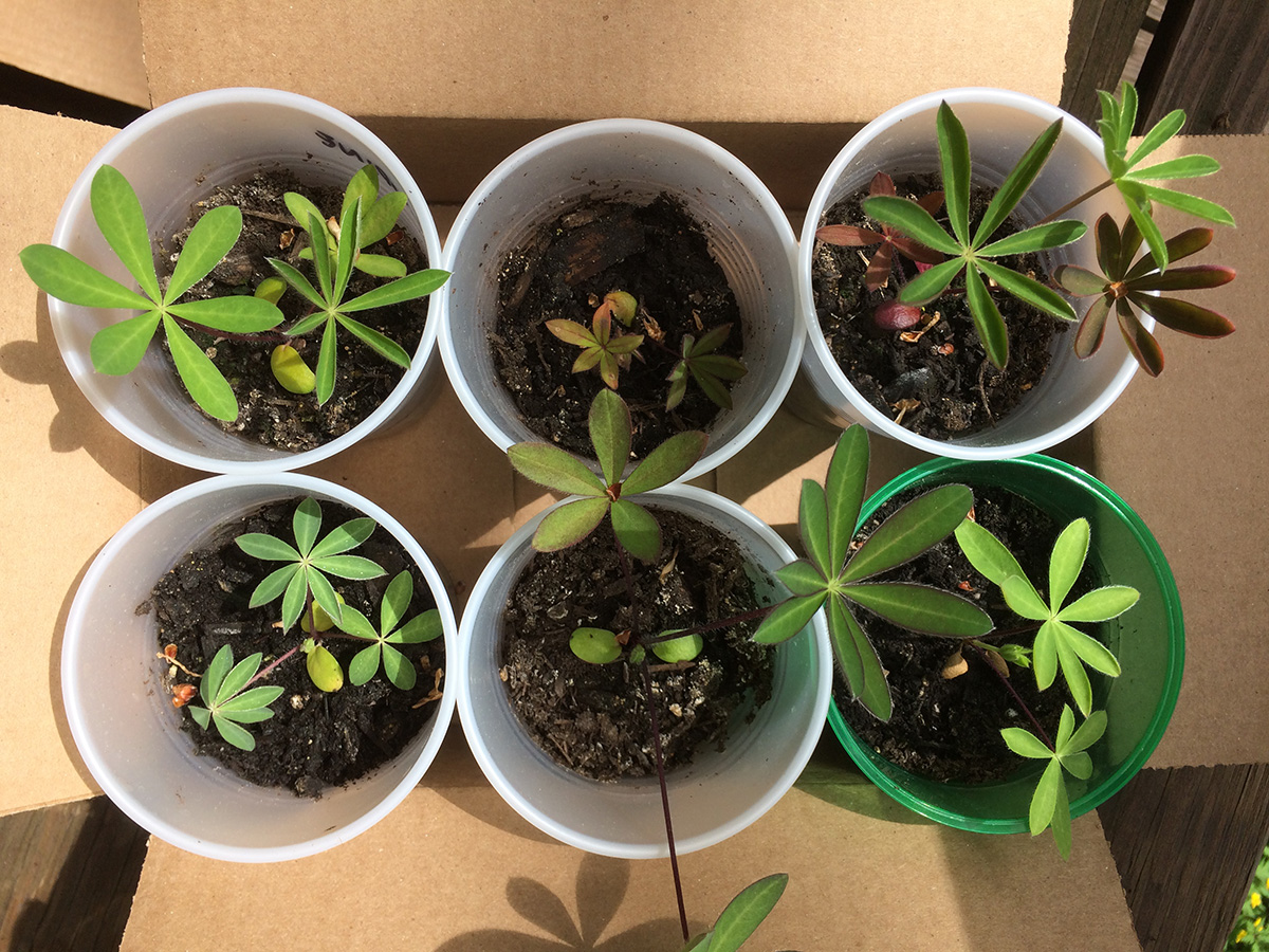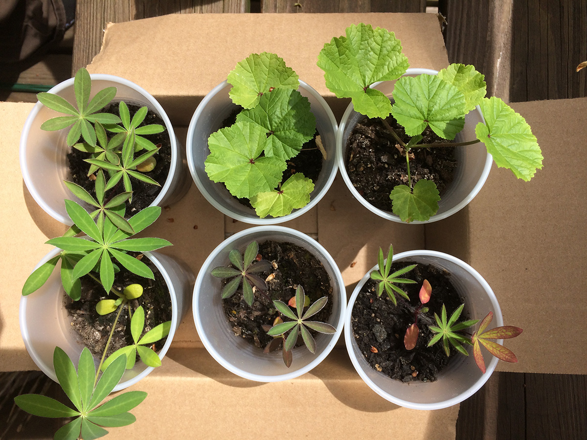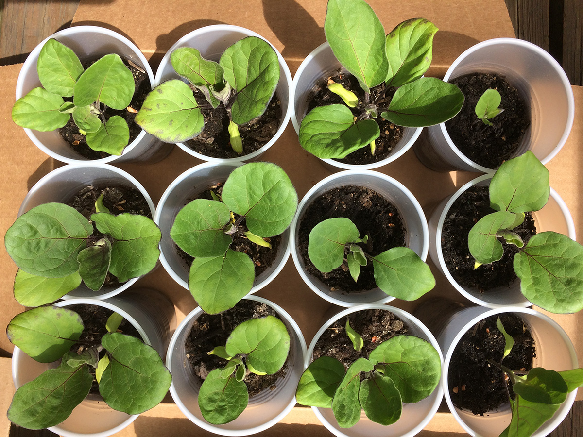 i left a bunch of seedlings out on the backyard porch last night, as the temperature wouldn't dip below 60°F. this morning they got a full dose of sunshine and warmth, as the temperature rose to 84°F, a degree shy of the 1974 record high. i watered a few that looked thirsty and put them back into their boxes.