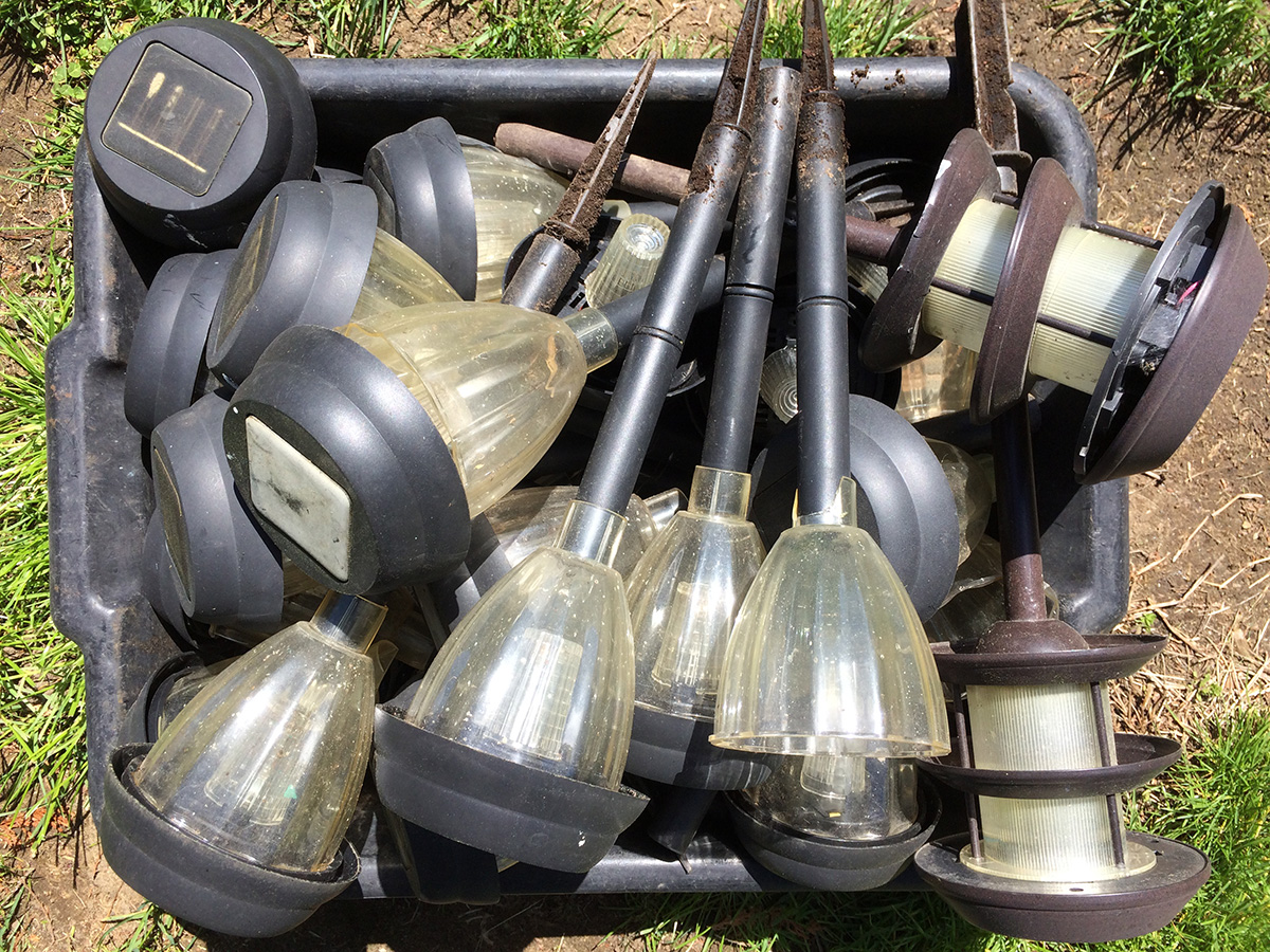 back in 2010 i went crazy for solar lights. i also found a bargain at the family dollar store when they were selling for $1.50 a piece so i ended up getting 2 dozen of them. that season the backyard was pretty sweet, a perimeter of led lights illuminating everything at night.