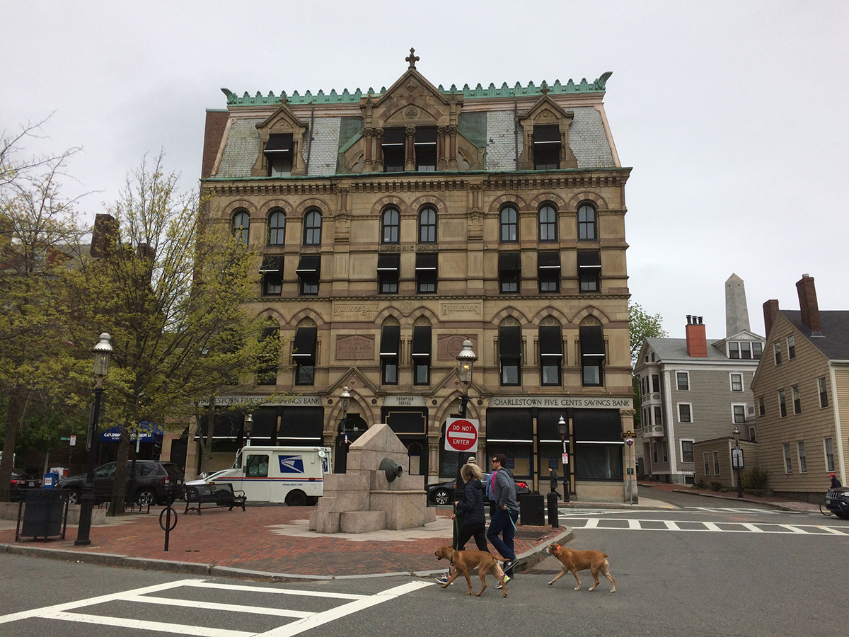 from winter hill i went up to broadway and continued east through the snarl of sullivan square car traffic to get to main street in charlestown. i stopped once to admire the charlestown five cents savings bank in thompson square (never seen it before), built in 1876 in the victorian gothic style.