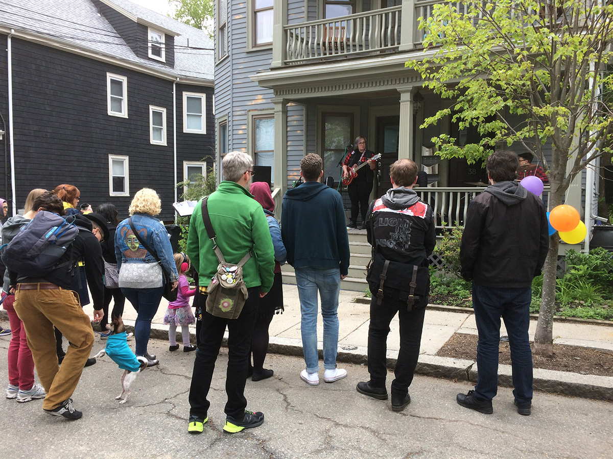 the first place i visited was park place to see hauskat, an 80's cover band. it wasn't far, but a private road coming from a one way downhill, so it took some finesse to get there. i saw the band setting up but there was nobody around. they told me they didn't start until 1pm, which wasn't until 30 minutes later, so i continued on my way. next i went to oxford street to see the powderhouse kids, another 80's cover band, but nobody seemed to be home. however, further down the street spectators had congregated to hear weather weapon, a punk rock band. i stayed for a few minutes but i really wanted to hear some sweet 80's music so i left soon afterwards.