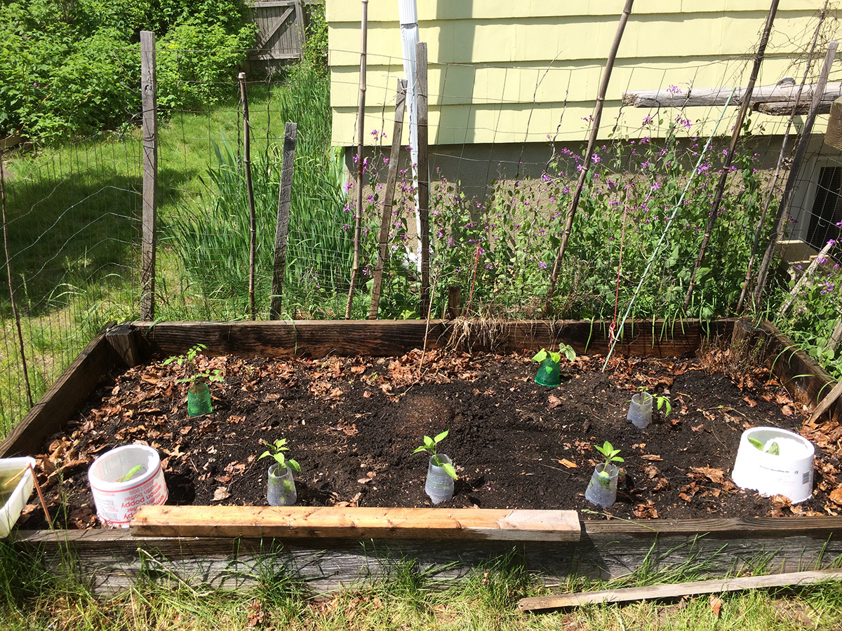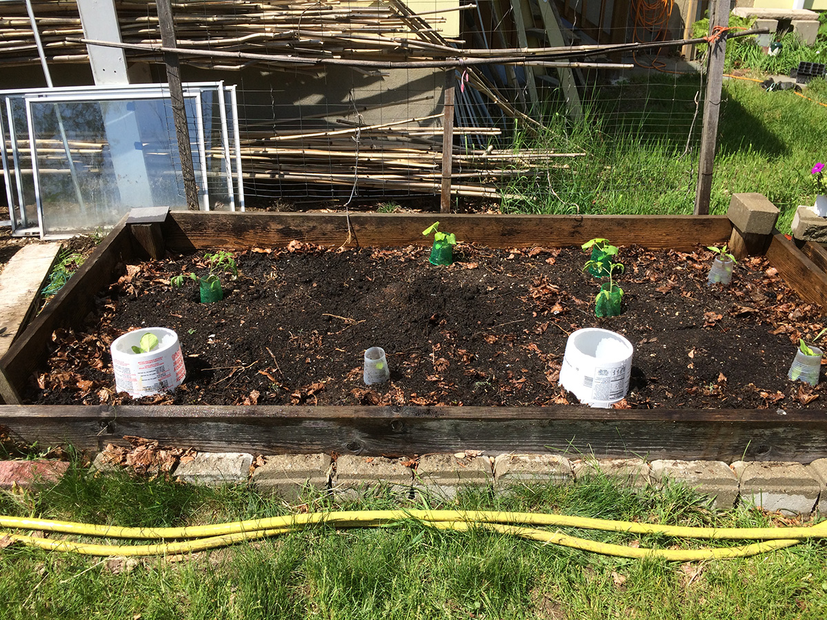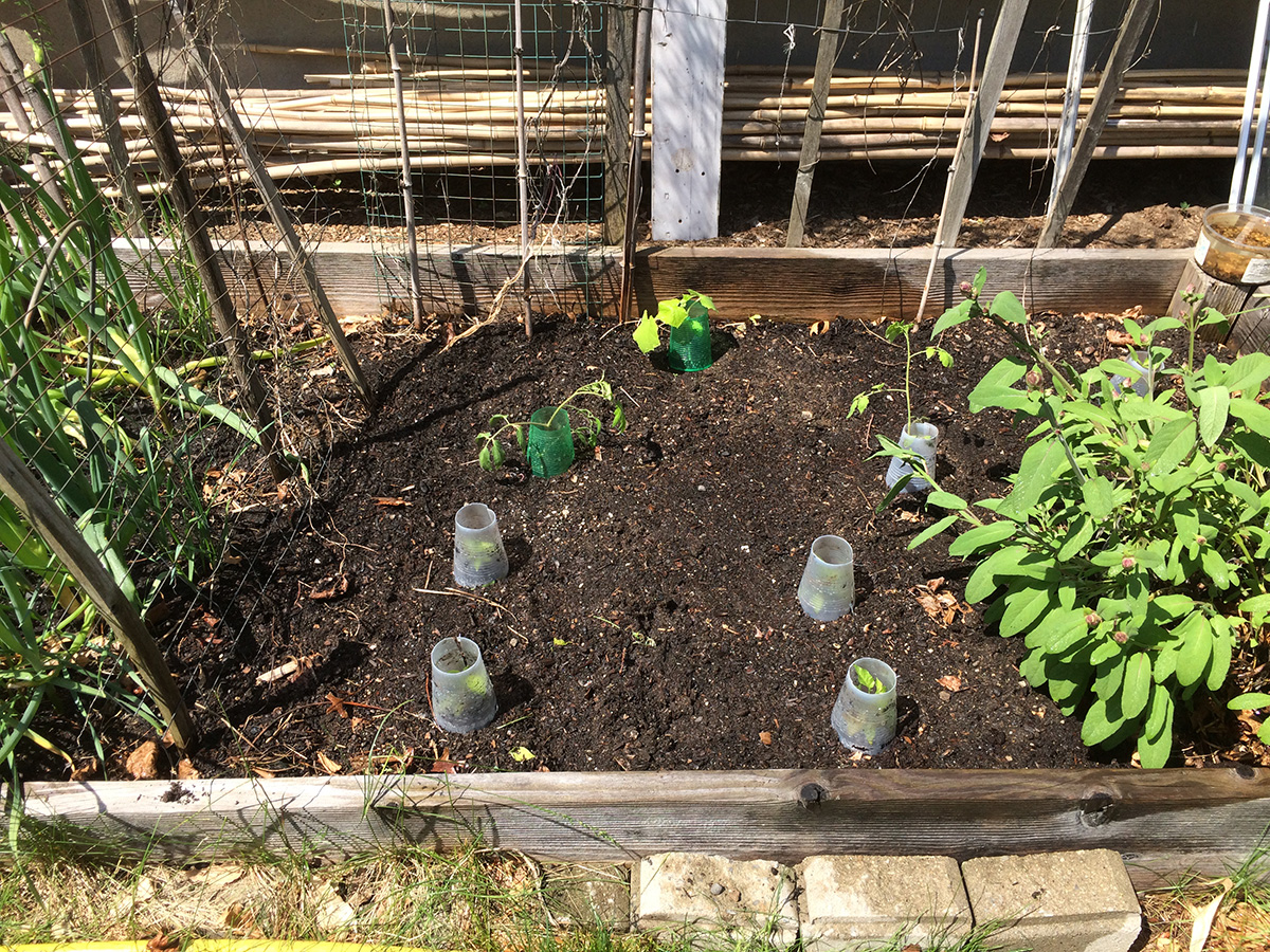 into each hole i scooped some plant-tone fertilizer (i've nearly used up the entire bag). i cut off the bottoms of the plastic cups i used as pots to make makeshift seedling protectors, since in years past we had problems with unknown backyard critters biting the seedlings in half. i also planted some seeds: 2 mounds of zucchini squash, nasturtium in every raised bed corners, and a dozen moonflowers. my father returned to the cafe before i finished planting, but i was done shortly afterwards. i returned home by 2:30pm.