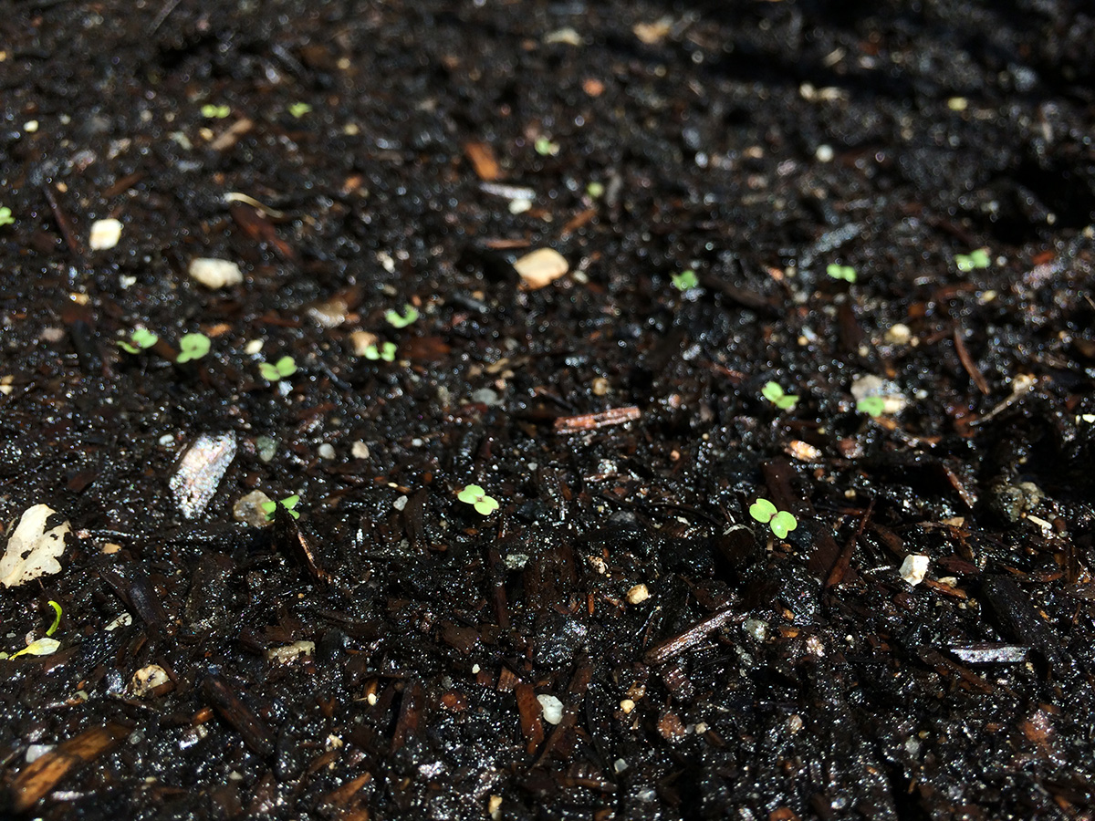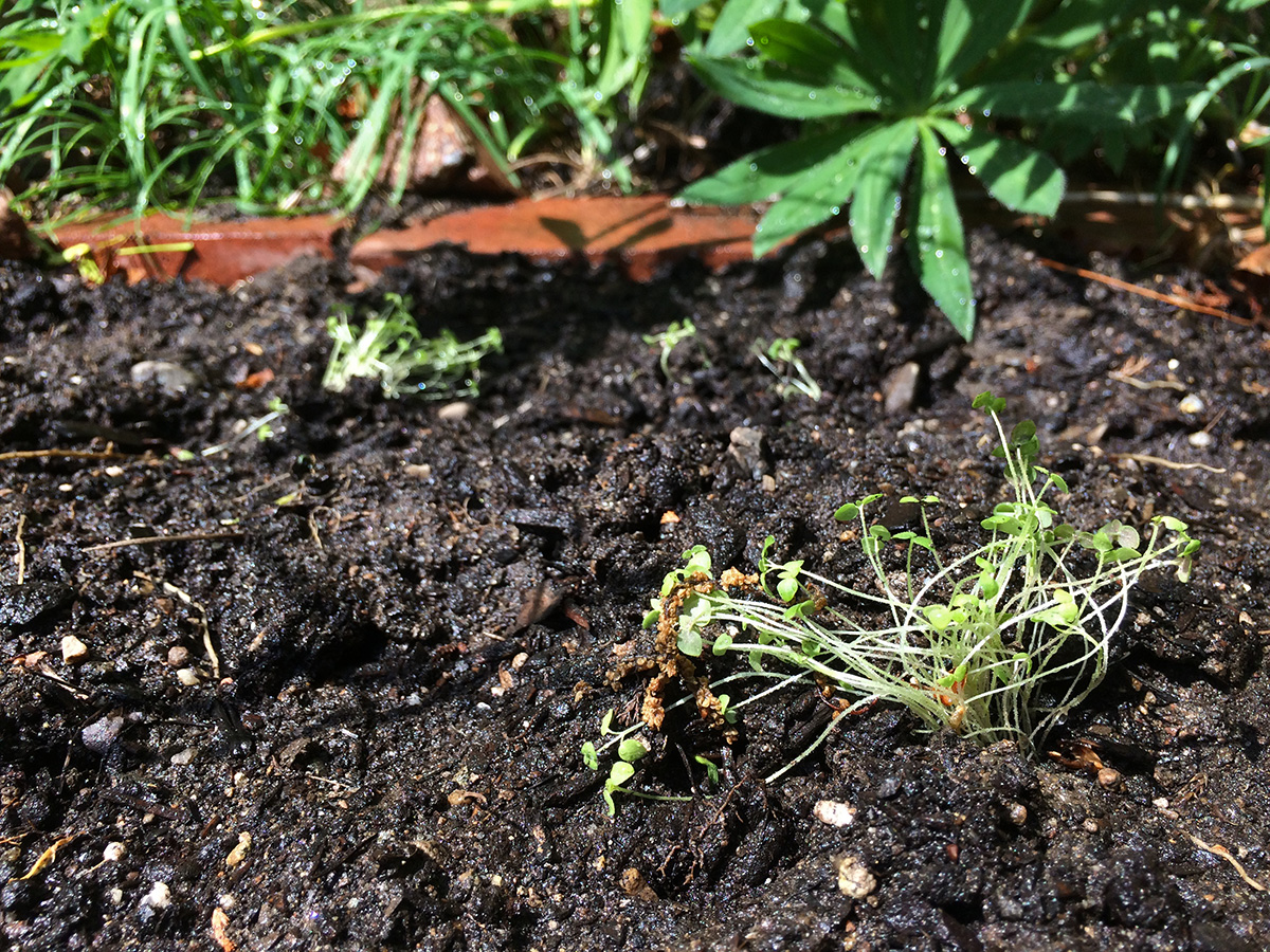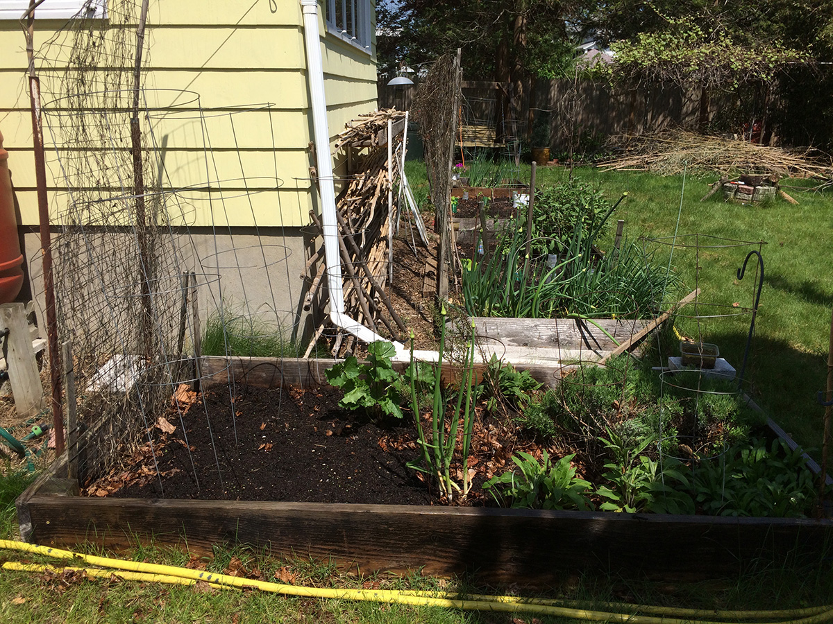 into each hole i scooped some plant-tone fertilizer (i've nearly used up the entire bag). i cut off the bottoms of the plastic cups i used as pots to make makeshift seedling protectors, since in years past we had problems with unknown backyard critters biting the seedlings in half. i also planted some seeds: 2 mounds of zucchini squash, nasturtium in every raised bed corners, and a dozen moonflowers. my father returned to the cafe before i finished planting, but i was done shortly afterwards. i returned home by 2:30pm.