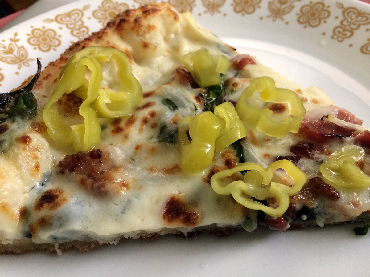 the thing with domino's is their pizzas can change from one store to another, and even within a single store the pizza can be different depending on who made it. so today's pizzas had a much thicker (bready) crust, and the ingredients didn't seem so fresh. my grandmother seemed to have remembered more pineapple last time, and they were embedded in the cheese instead of just sprinkled on top. there also wasn't a lot of mushrooms, just some dried pieces. as for my sister, with her supposed gluten-allergy, she went to the nearby thai place to get some takeout instead. as there wasn't anymore room in the living room, she ate in the kitchen with her dog watching nearby.