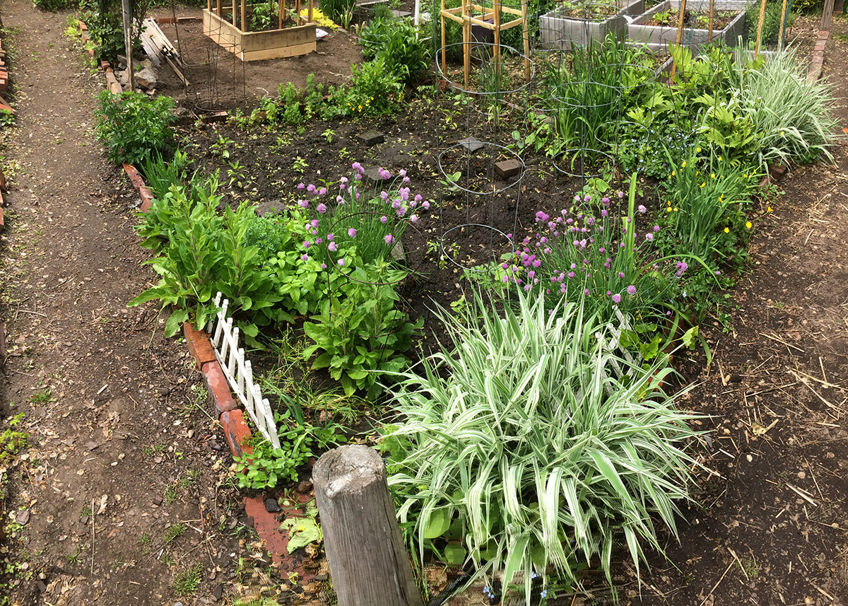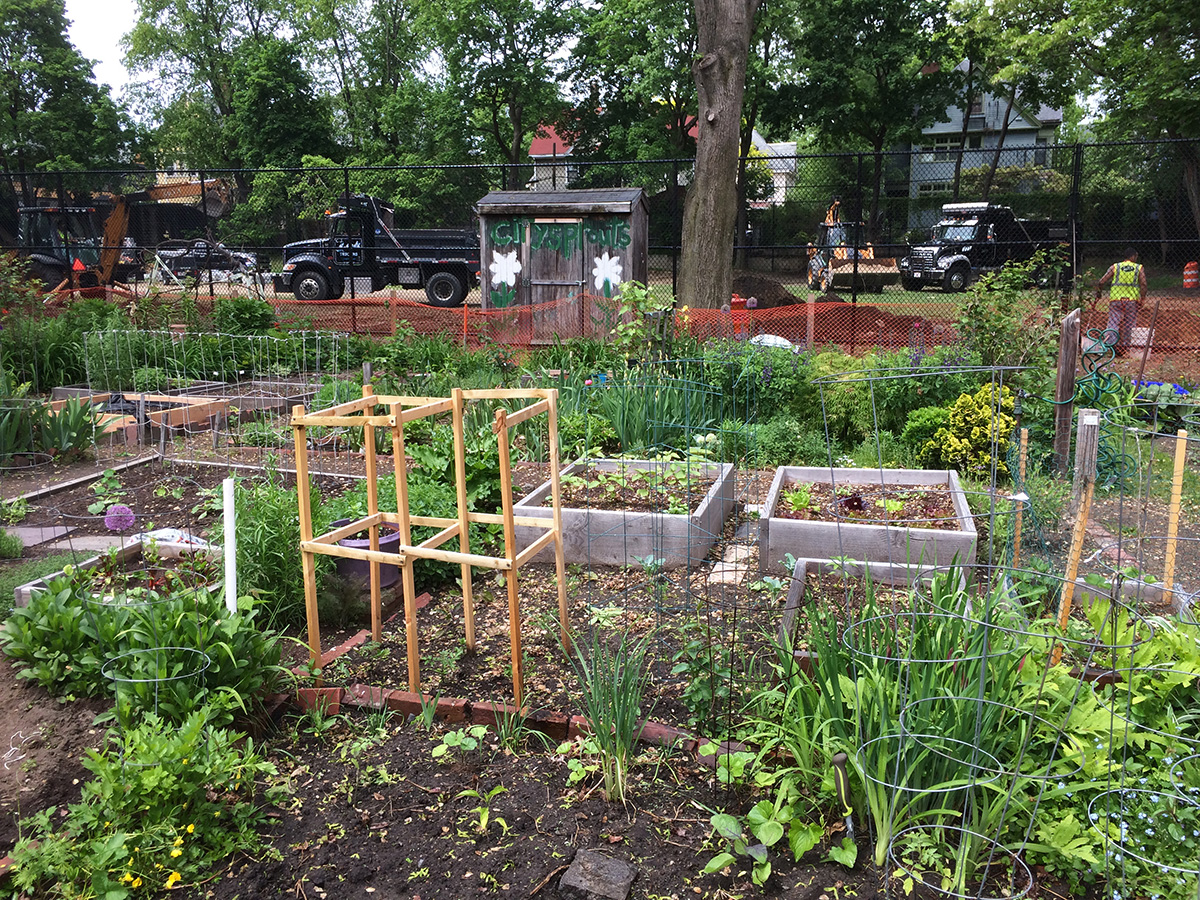 i went to the community garden to water my plants. somebody (most likely the gardener next to mine) had planted a shovel in my plot, as well as a small gardening trowel. the construction on the new playground renovation is currently undergoing, which meant the formerly peaceful community garden is now a loud and profane (i overheard a few construction guys swearing at each other) construction site. i noticed a lot more people have planted tomatoes. while their store-bought transplants look healthy and thick-stemmed, my indoor-raised transplants all look thin and sickly, barely alive. i'll have to reconsider my indoor growing strategy for next season, maybe more lights. there was a woman there hopping from plot to plot. at first i thought maybe she was stealing plants, because i also saw her digging in the DMZ, but she didn't look like the type of person who would steal. maybe she was putting in her 2 hour of communal garden work time.