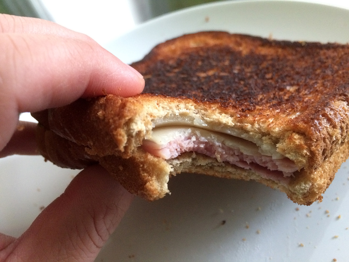 i made an attempt at making a grilled ham and cheese sandwich. despite the simplicity of the recipe, i've never made one before and went online searching for a tutorial. i sort of followed this recipe. i buttered the split top whole wheat by first melting the butter in the pan and then using the bread to soak up the butter (the butter was not soft enough that i could spread it on the bread any other way). i put down a layer of swiss cheese followed by two slices of krakow ham. i spread some mayonnaise on the other slice of buttered bread. i then grilled the sandwich until both sides were crispy brown. it tasted surprisingly good, although the swiss cheese didn't particularly melt (it was soft however).