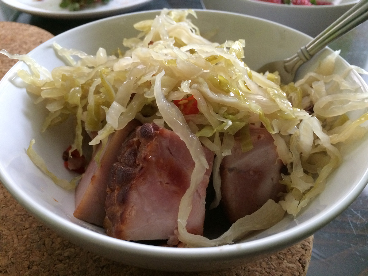 i had some leftover smoked ham in the fridge i wanted to get rid of. suspicious of their safety (they felt a little tacky), i grilled them in the pan before eating them mixed with some sichuan sauerkraut. i also had half a dozen cream puffs and half a carton of old strawberries.