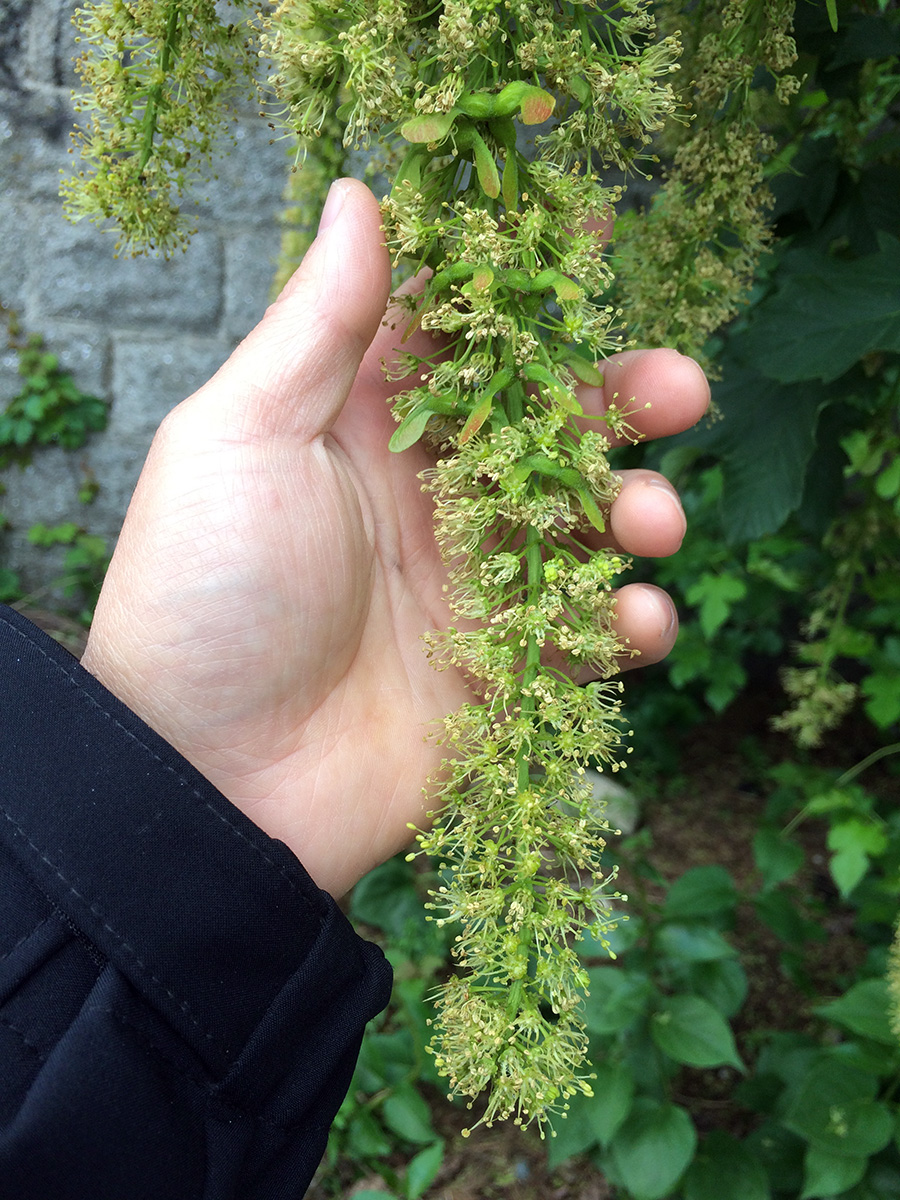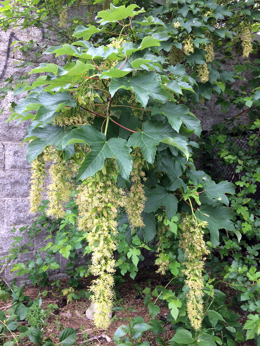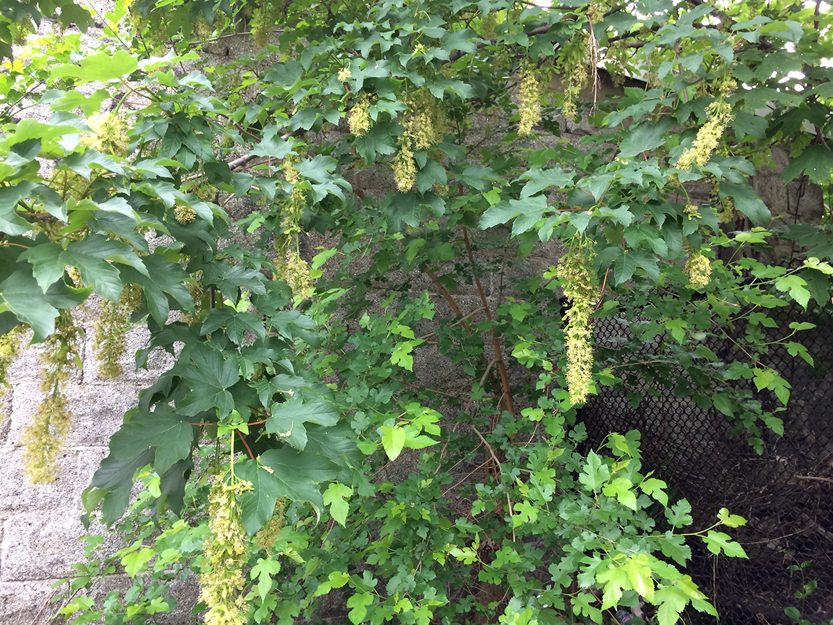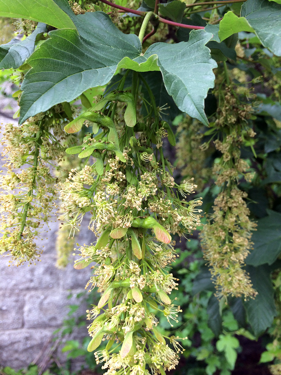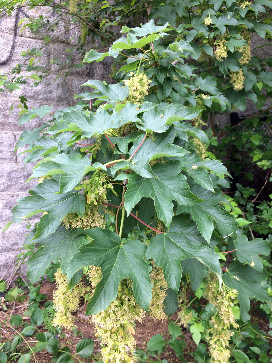 walking back i found another one of those mysterious maple-leaf tree with the cascade of drooping flowers. this one was growing by the fence above the underground shortcut behind star market. i thought they were sycamores but the maple wings on the flowers definitely mean they're some sort of maple. it's not often i come across a plant i've never seen before. after a lengthy search, i think the tree in question is actually a sycamore maple (Acer pseudoplatanus), not to be confused with the american sycamore (Platanus occidentalis). sycamore maples are native to europe but a naturalized invasive species in america.