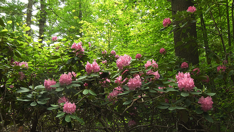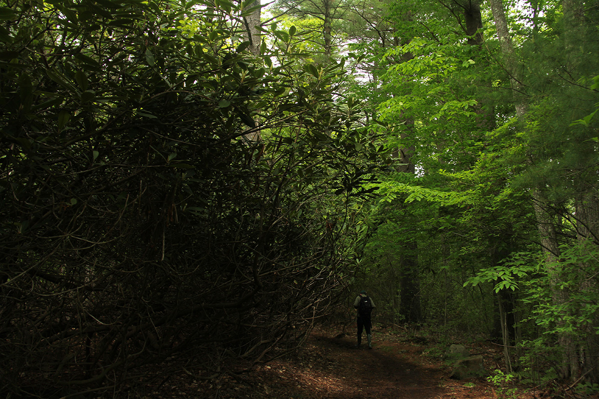 the path wasn't entirely devoid of colors: here and there were some blooming rhododendrons and azaleas. but the flowers were few and far in between and not very spectacular. there were a few rhododendrons that weren't in bloom yet (which makes me think that they bloom earlier when they're in full sun instead of a shady forest). there were also tall sheep laurel shrubs that hadn't bloomed yet either (they appear later in the season).