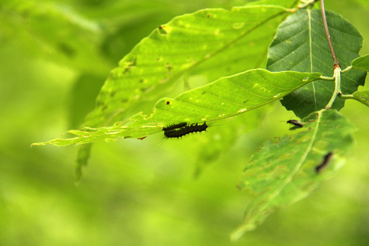 a second annoyance was the explosion of caterpillars. i believe they were immature tent caterpillars that recently hatched, as they were still quite small, but the forest canopy was filled with them, and in matter of weeks i can easily imagine much of the trees