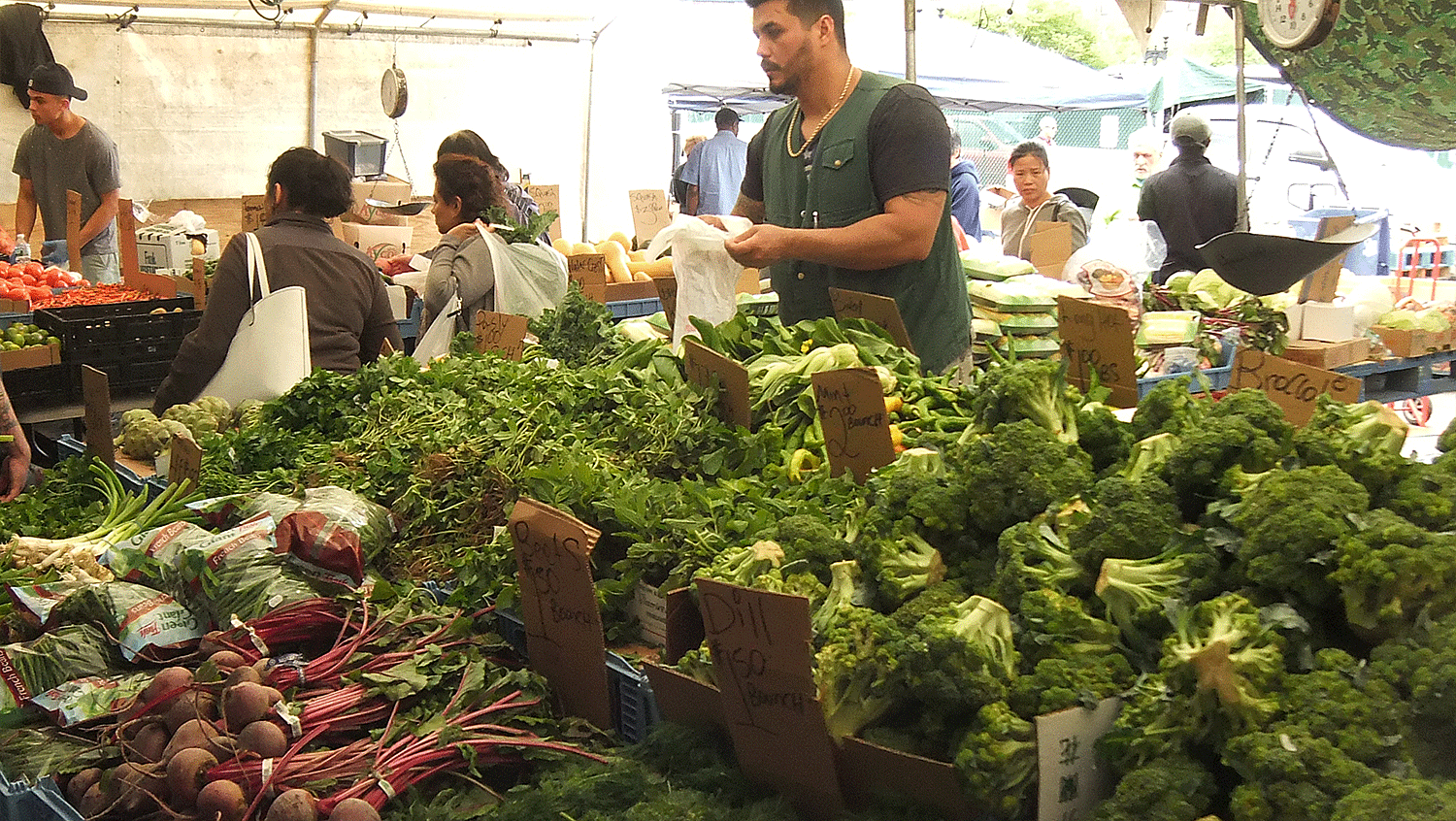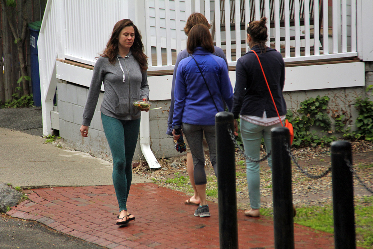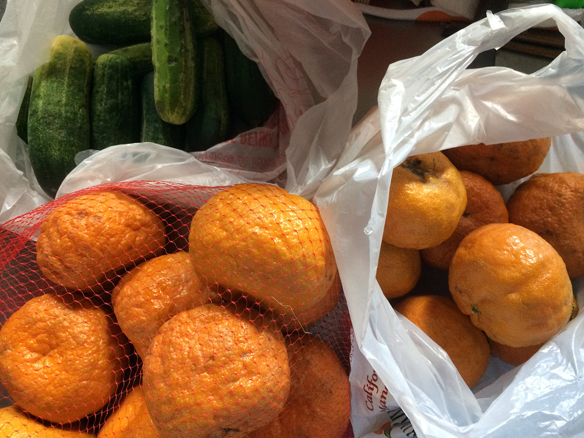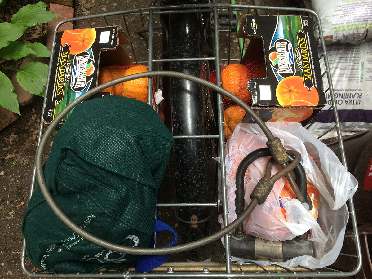 it took a while to fit everything into my two rear bike baskets: heavier produce and those not at risk of bruising on the bottom, delicate vegetables on the top, and a few in my carry bag. i then came back to cambridge via the longfellow bridge. i stopped at my house briefly to unload some oranges before taking the rest to the cafe.