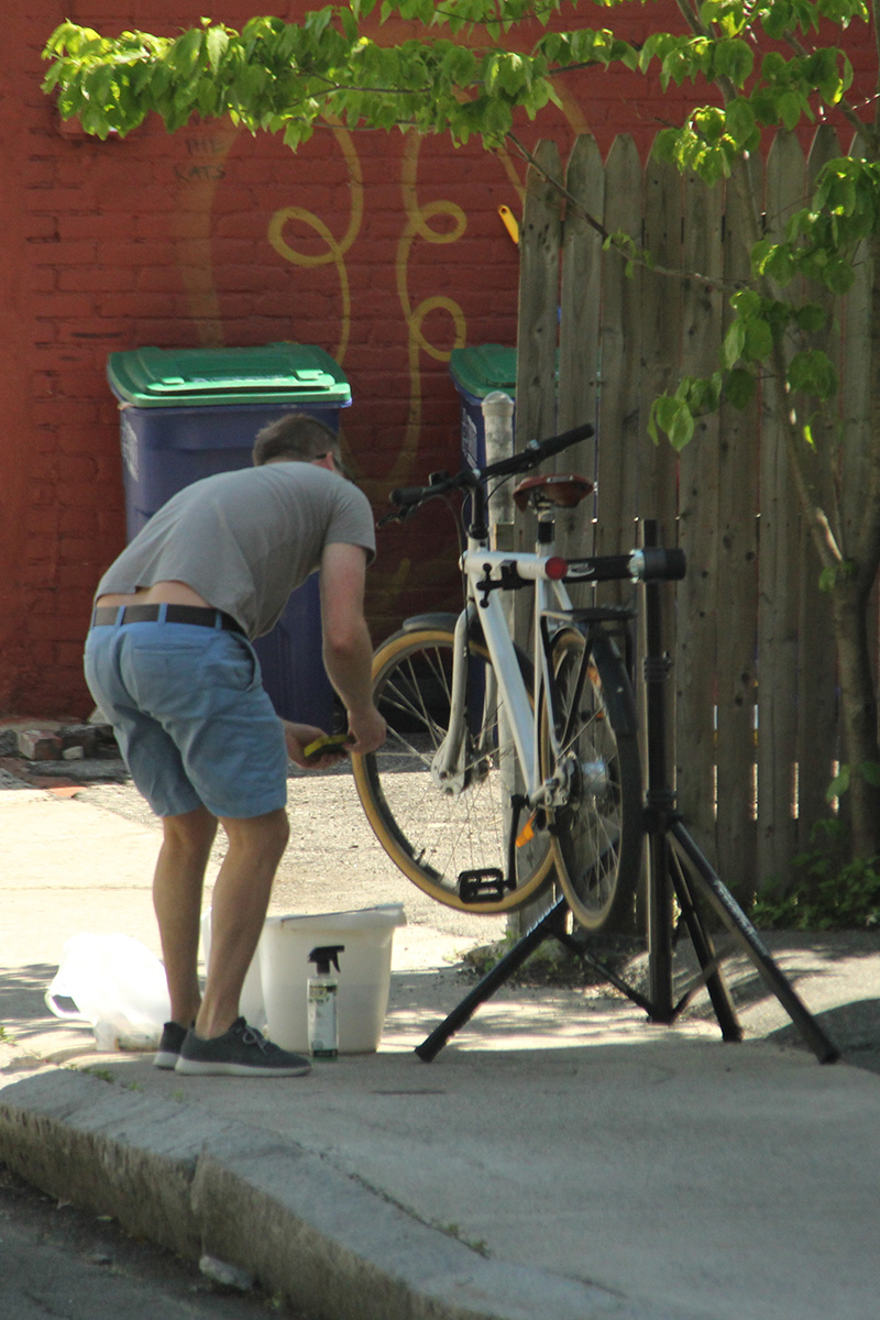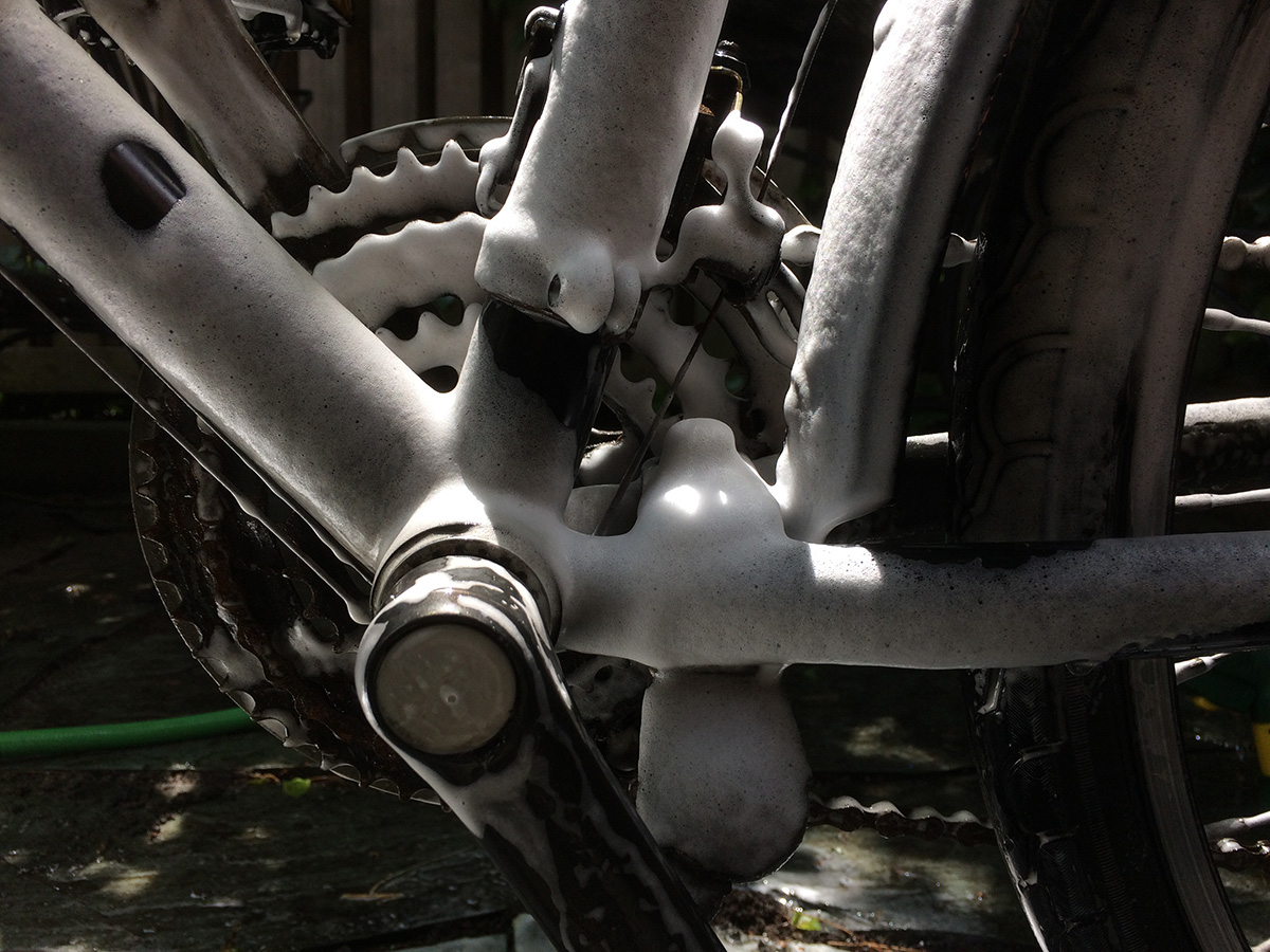 after a pineapple greek yogurt for lunch, i was in the backyard to wash my trek utility bike after seeing one of my neighbors washing his (a fancy vanmoof no less, i've never seen the neighbor before, nor his bike). i used to use simple green bike cleaner, but i've discovered simple green heavy duty bbq cleaner works just as well and for far less money (i get mine from home improvement stores).
