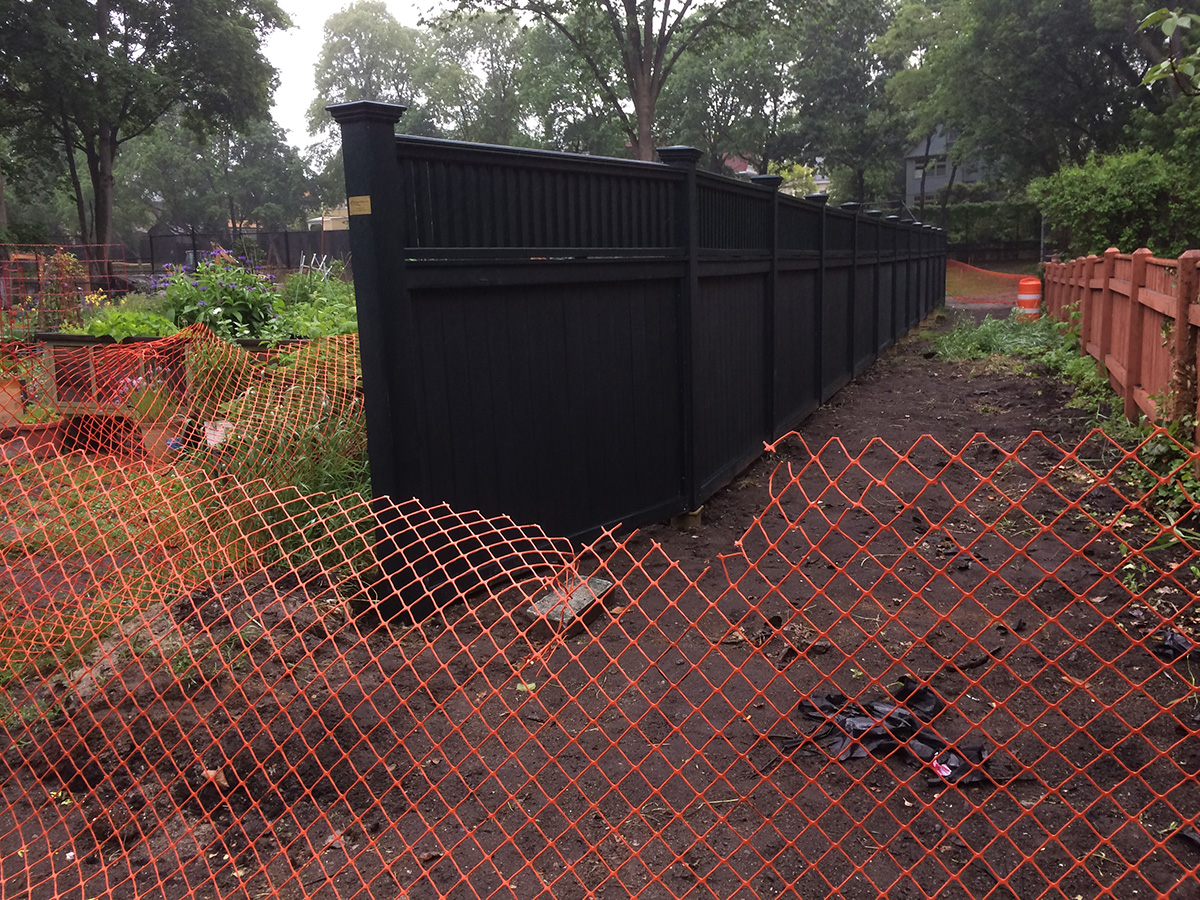 no one else was in the garden but i did see the new fence the city put up. unfortunately it's several feet too tall, and there was a lot of community garden activity getting people to write to the city to complain. when i got to my plot i saw beth working on her own garden. she showed me a bunch of zinnias that'd been stripped by what i imagine to be slugs. her kale was also getting eaten, and that one was easier to solve, because all the dark pellets meant there was a caterpillar feeding on her plant. while we were talking anne marie showed up. that's when i noticed she had already put the monkshood and astilbe in my garden. i also picked up a large hosta from the pile of extra perennials she collected.