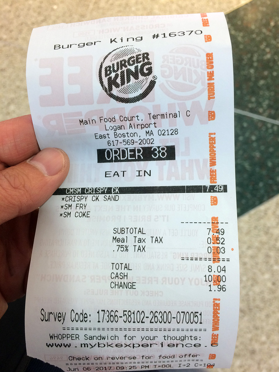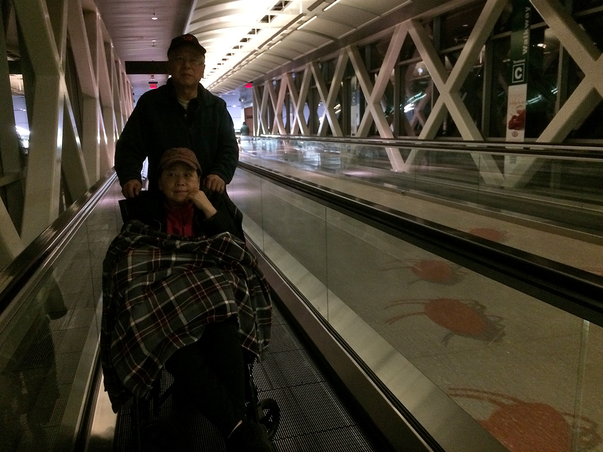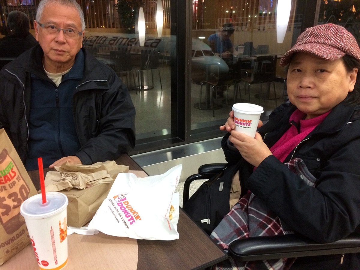 i hadn't had dinner yet so i got some burger king takeout from the food court at exorbitant airport rates. we brought the collapsible wheelchair for my grandmother (just in case) but my mother sat in it the whole time, enjoying the luxury of being wheeled around. while we ate, my mother did end up calling my grandmother, partially to check up on her, partially to let her know of our plan in case of another delay. my grandmother said she got help from some other old ladies, who gave her some water. my grandmother also stashed some food in her coat and ate that as well.