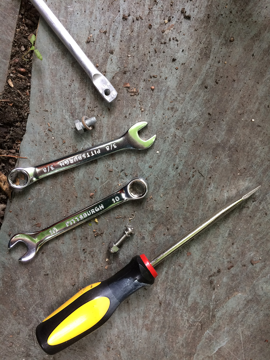 i went out in the backyard and fixed the fuji rear rack. it actually makes more sense to have all the connections be replaceable screws instead of the original long rivets. i put the bikes away in the basement in anticipation of the rain which never did come. the sky turned grey for a bit, but then the sun came out again. by then i was already unpacked in the living room and wasn't planning on going out the rest of the day.