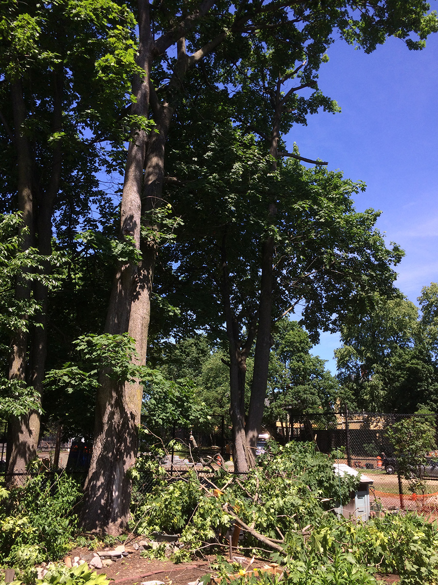 i walked to the community garden to water my plants. it probably wasn't all that necessary considering the deluge of rain we experienced yesterday. i wasn't expecting any damage but apparently large branches from a tree on the left side of the garden had been sheared off.