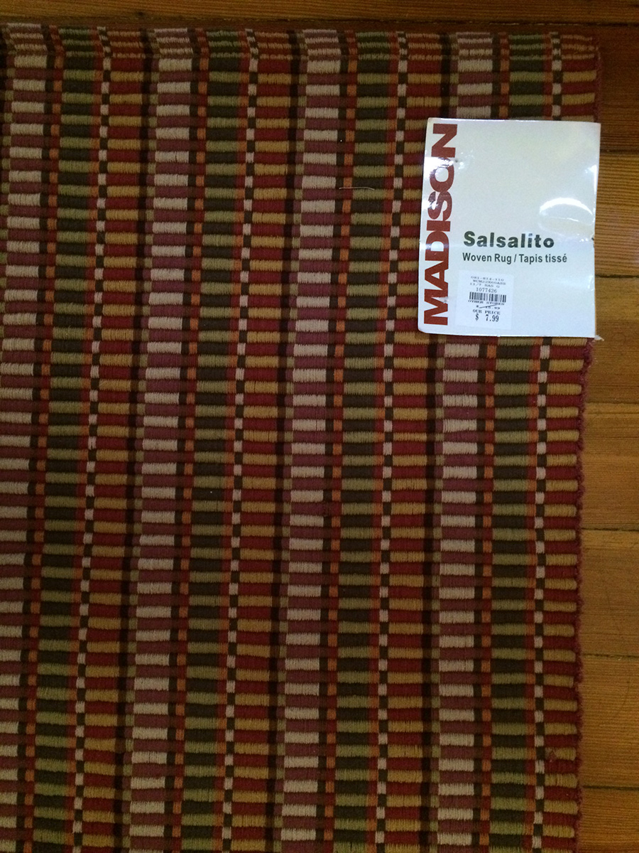 coming back, i passed by the somerville target and stopped inside to look for rugs. they had a few but i didn't like any of them. besides, they cost too much, $30 at least for a tiny ugly rug. i did eyeball a blue ottoman that was on sale for $30, to replace my broken ottoman. i like that they could also be used for storage. i would've bought it right there but i couldn't carry it back on my motorcycle. finally, i went next door to fallas discount store. they had some home furnishing goods as well (though nothing as namebrand as marshalls or tj maxx). i didn't find the accent rug i wanted, but i did buy a long woven runner rug for only $8.